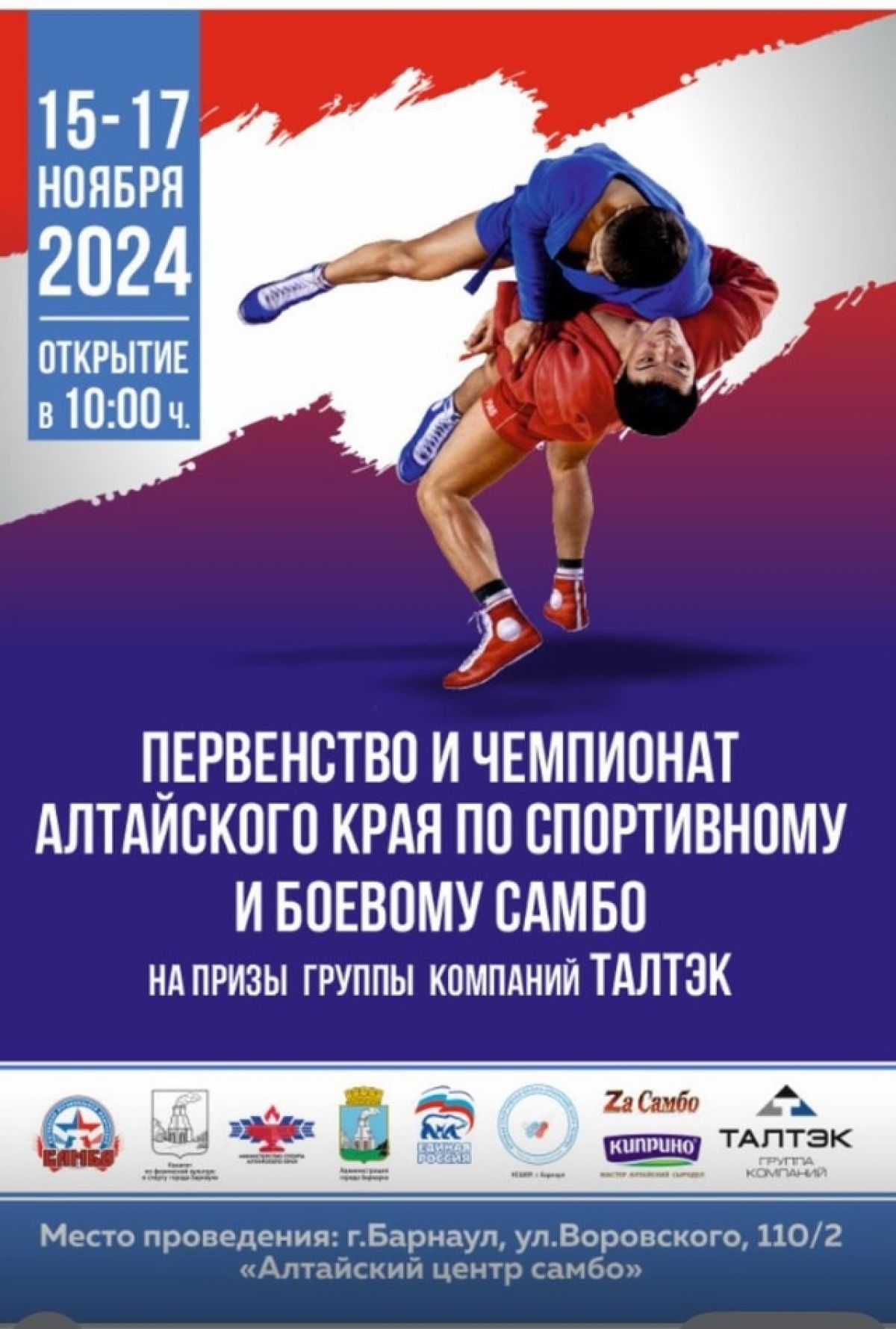 15−17 ноября в Барнауле на базе Алтайского центра самбо пройдет чемпионат Алтайского края по самбо и боевому самбо среди мужчин и женщин старше 18 лет (2006 год рождения и старше), на призы группы компаний ТАЛТЭК.