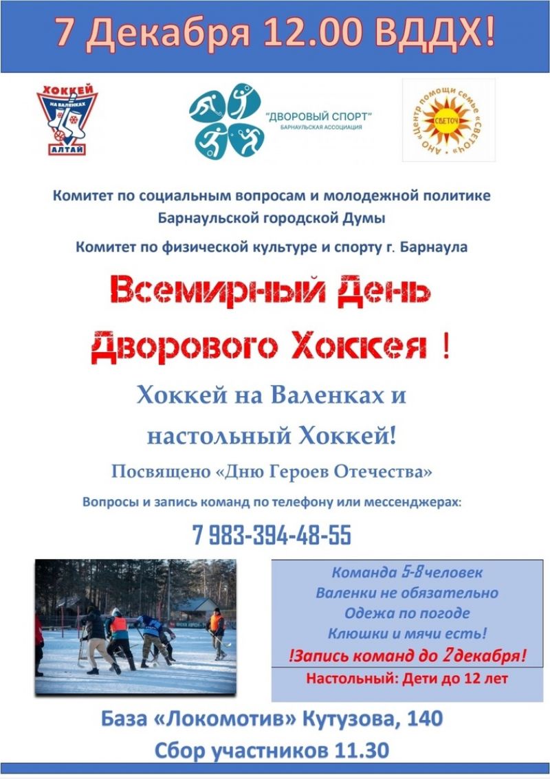 7 декабря в Барнауле на лыжной базе РЖД «Локомотив» (ул. Кутузова, 140) состоится турнир по дворовому хоккею (хоккей на валенках) в рамках празднования Всемирного Дня хоккея на валенках и приуроченный ко Дню Героев Отечества.