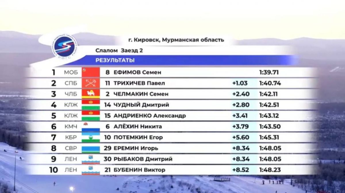 После первой попытки Семён уступал именитому Александру Хорошилову три десятых секунды, но Александр сошёл на второй трассе, а Семён уверенно добрался до финиша, опередив в итоге на секунду Павла Трихичева из Санкт-Петербурга. Бронзу завоевал челябинец Семён Челмакин. Стоит отметить, что организаторы соревнований подготовили коварную дистанцию, с которой в итоге не справилась большая часть стартовавших - сошли 49 спортсменов из 74! Так что нужно отдать должное нашему молодому горнолыжнику Андрею Иванову, который в итоговом протоколе занял достойное 14-е место.
