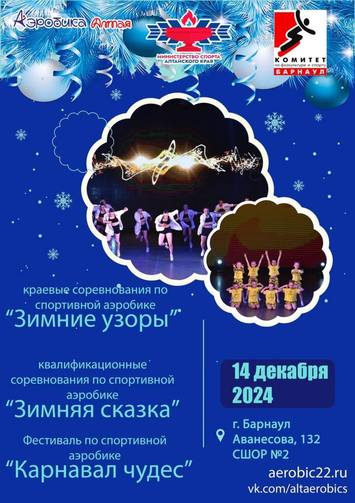 14 декабря в Барнауле в спортивном комплексе СШОР № 2 состоятся турниры по спортивной аэробике - краевые соревнования «Зимние узоры», квалификационные соревнования «Зимняя сказка» и фестиваль «Карнавал чудес».