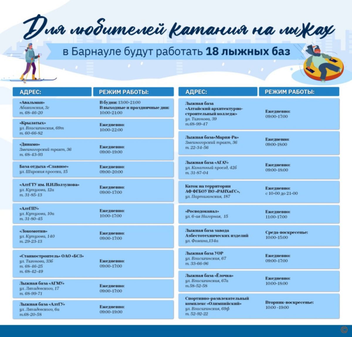 Напомним, в 15 минутах езды от центра города располагается горнолыжный комплекс «Авальман» (ул. Абаканская, 3-г), где можно покататься на тюбинговой трассе, горных лыжах, сноуборде.