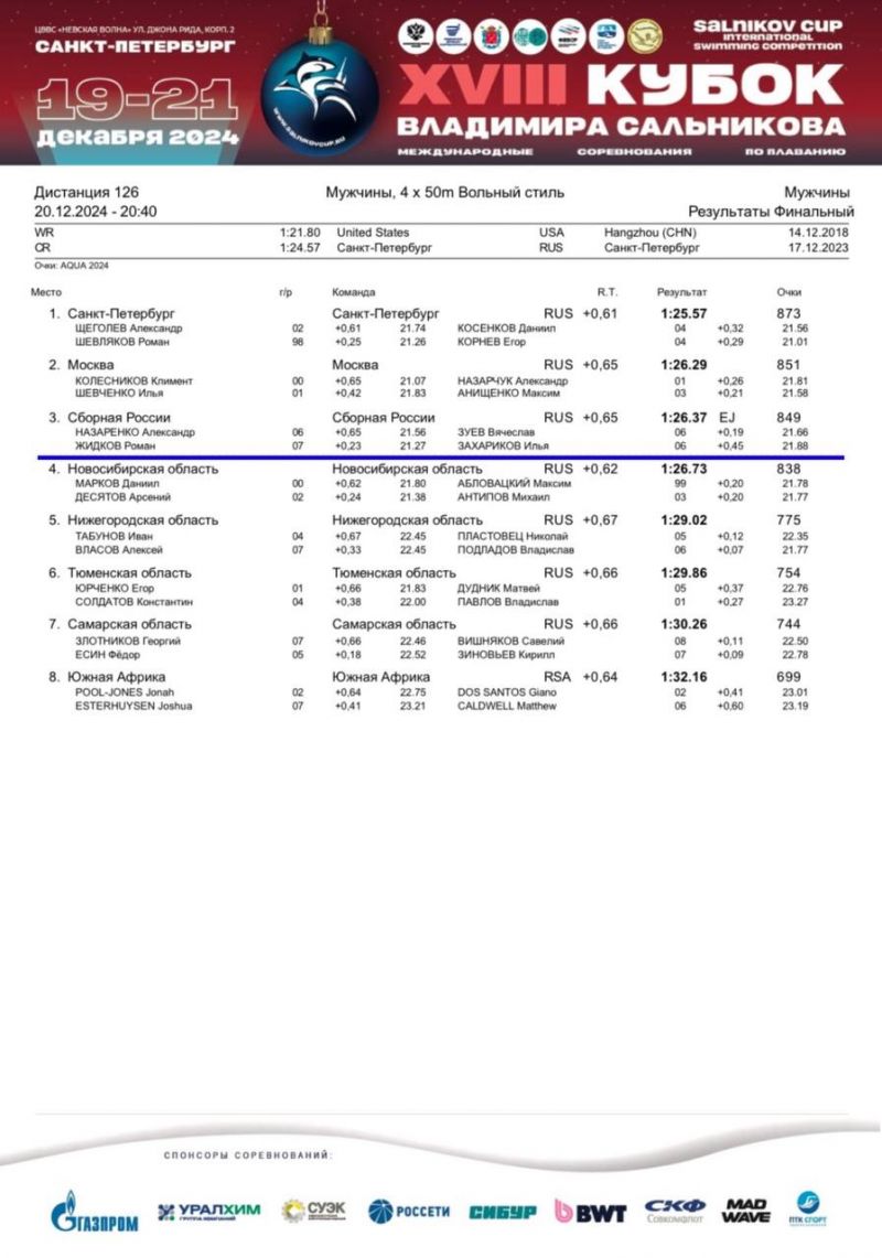 Вечером 20 декабря в финальном заплыве эстафетного плавания 4×50 м вольным стилем юниорская команда сборной России (Александр Назаренко, Роман Жидков, Вячеслав Зуева и Илья Захариков) финишировала с новым юношеским рекордом мира, Европы и России - 1.26.37! Квартет превзошёл прежний рекорд практически на секунду, а пловцы стали обладателями командной бронзы «Кубка Сальникова». Свой этап наш земляк преодолел за 21.56, что является его лучшим результатом на «полтиннике».