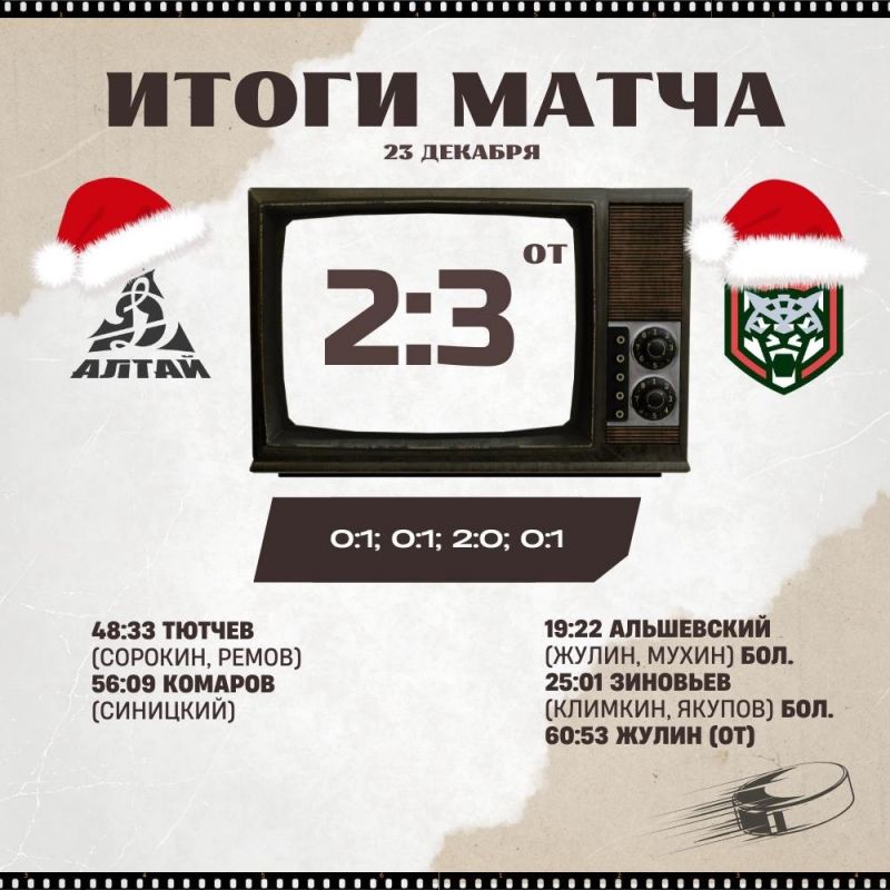 Не завершилась ещё первая минута овертайма, как матч завершился. Увы, «Динамо-Алтай» уступил. После падения Ю Сато в зоне атаки казанец Тимофей Жулин прошёл с шайбой по правому флангу, выкатился на наши ворота и поразил цель.