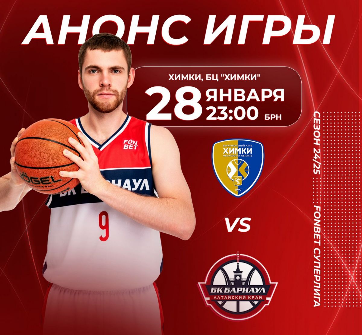Очередной матч чемпионата России по баскетболу в мужской Суперлиге БК «Барнаул» проведет вечером 28 января в подмосковных Химках против местного одноименного клуба.