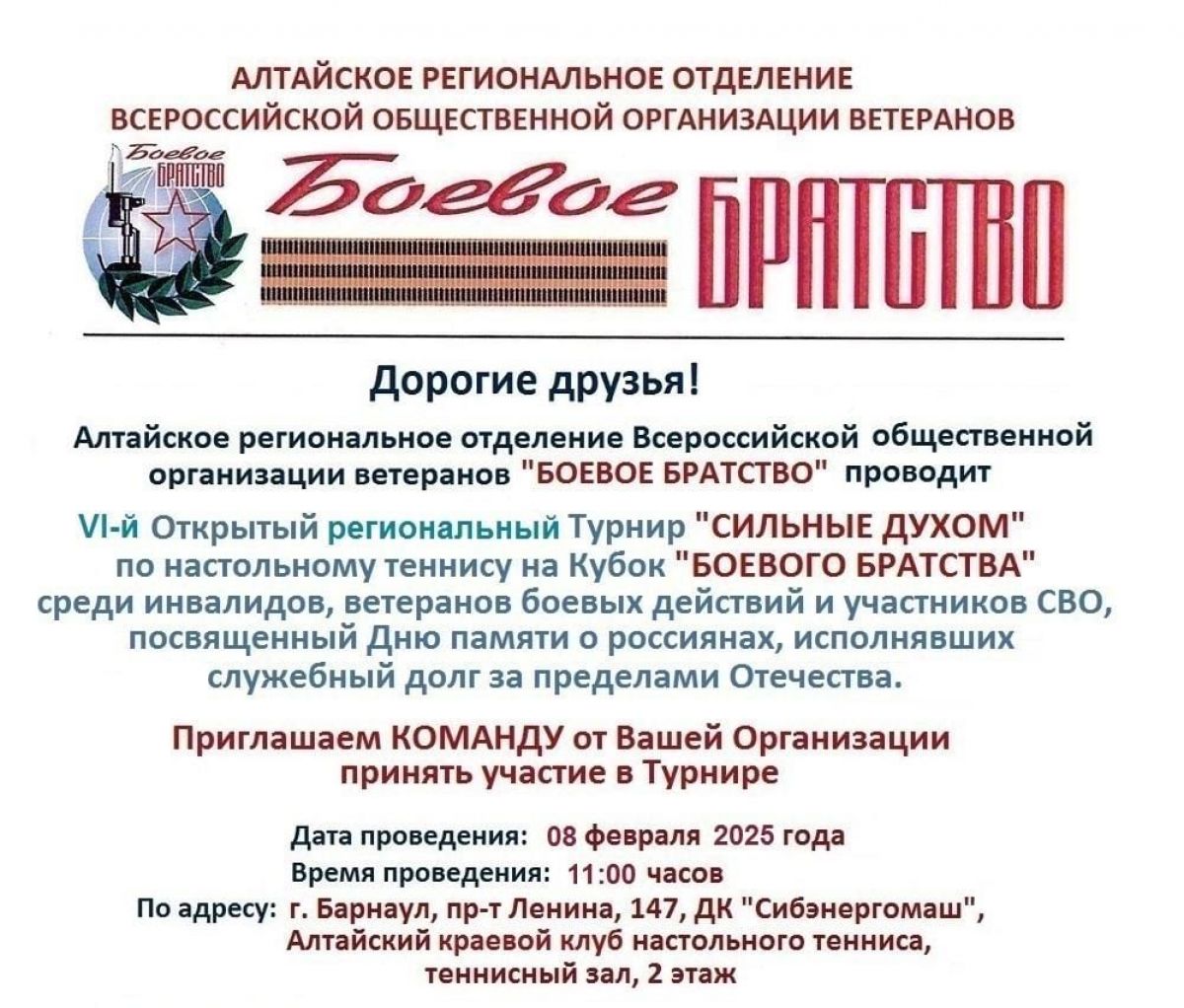 VI краевой турнир по настольному теннису «Сильные духом» среди инвалидов и ветеранов боевых действий пройдёт в Барнауле в субботу, 8 февраля, на базе Регионального центра подготовки спортсменов по настольному теннису в ДК «Сибэнергомаш» (пр. Ленина, 147).