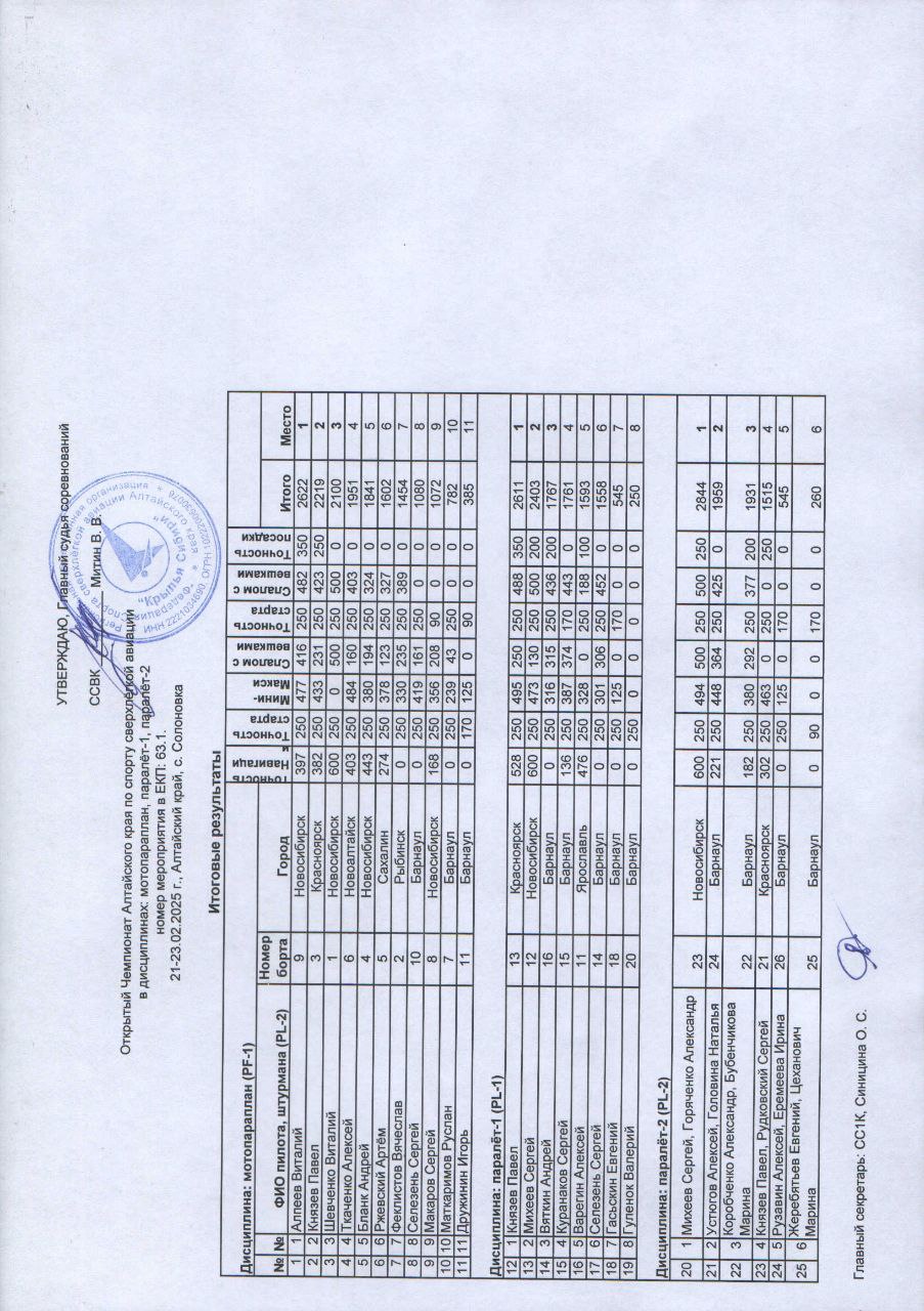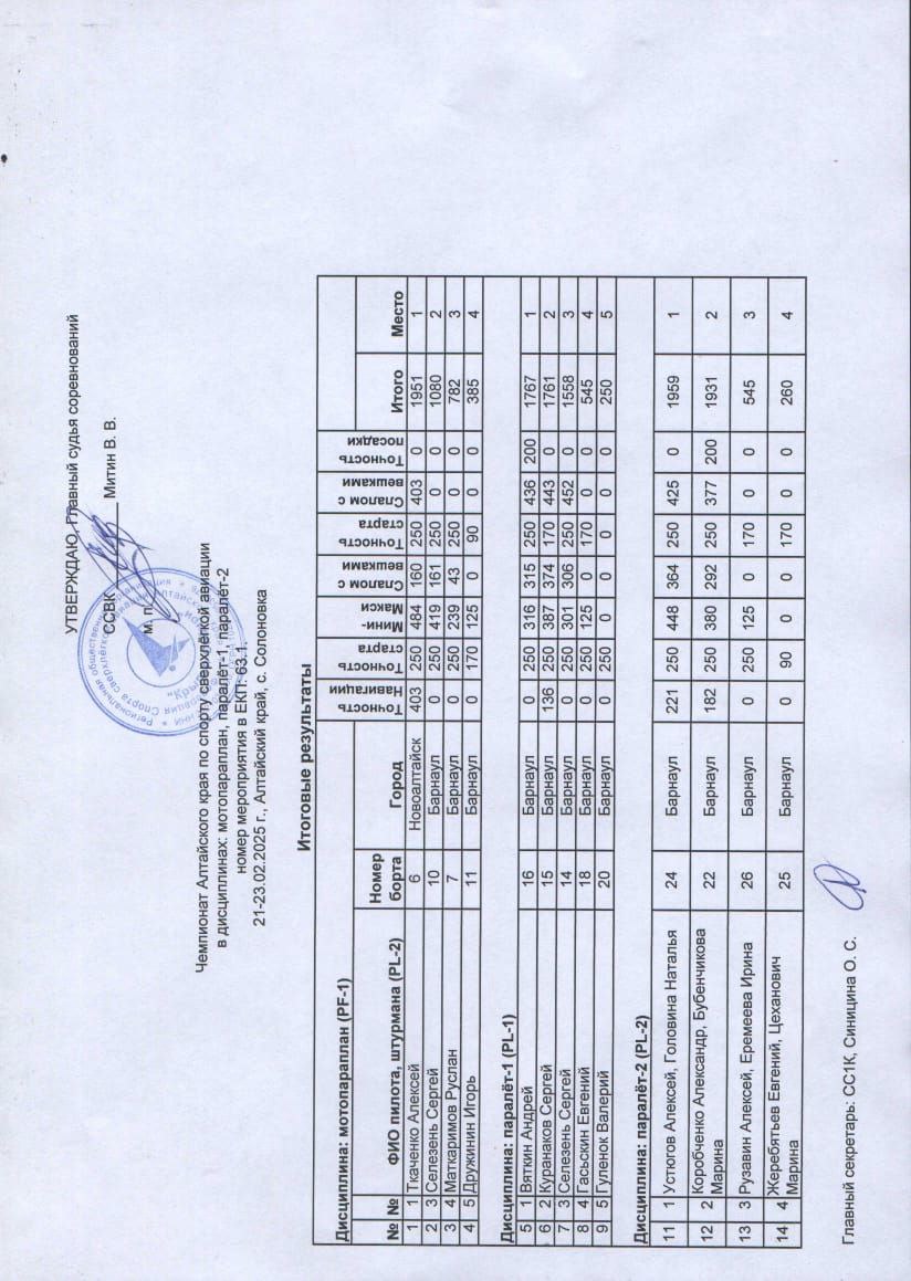 Лучшим из алтайских пилотов в дисциплине «мотопараплан» стал Алексей Ткаченко из Новоалтайска, в дисциплине «паралёт-1» - Андрей Вяткин из Барнаула, в дисциплине «паралёт-2» - Алексей Устюгов и Наталья Головина из Барнаула.