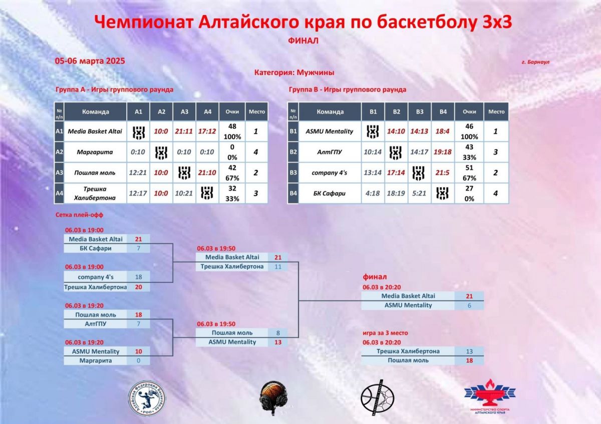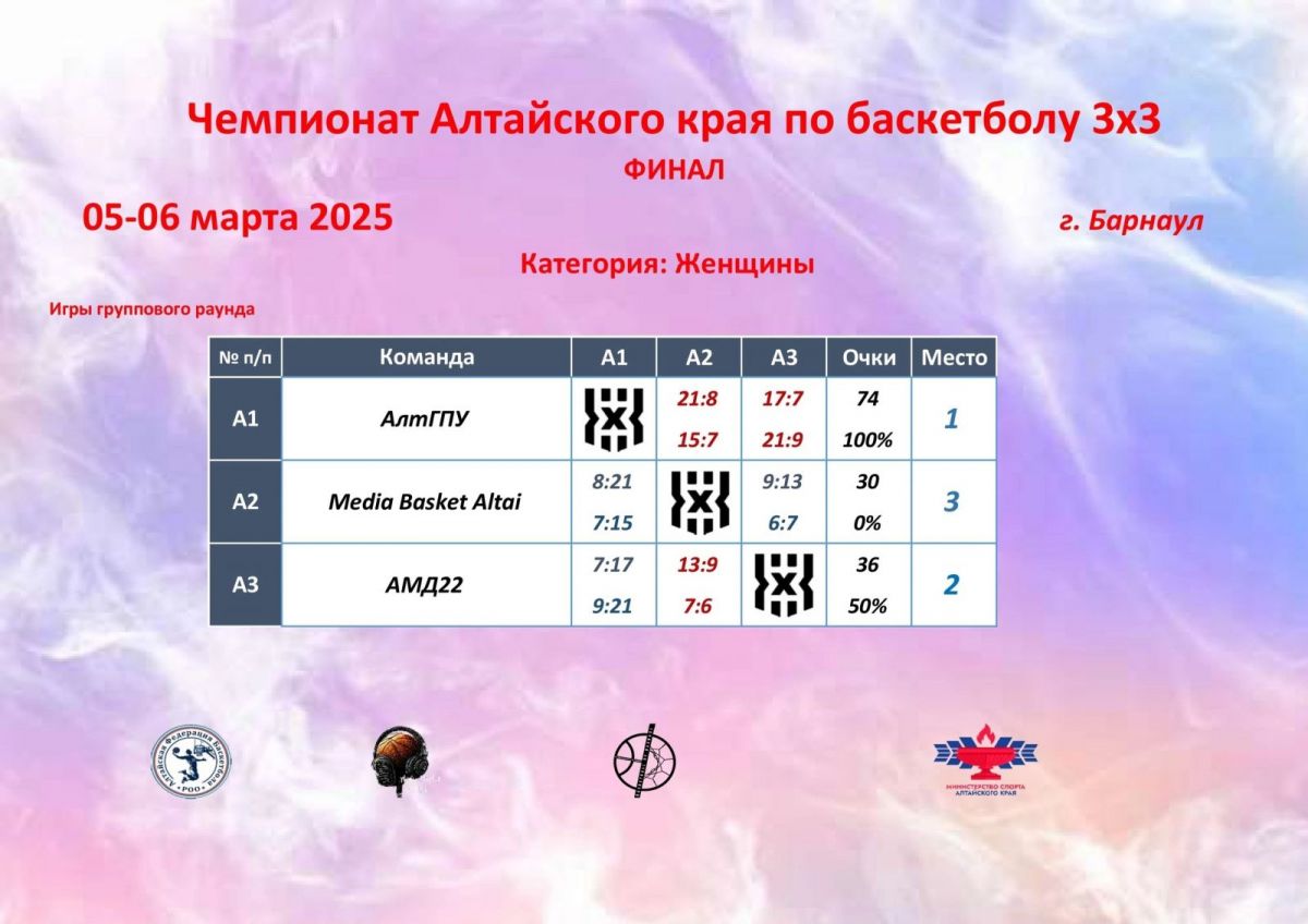 6 марта завершился первый чемпионат Алтайского края по баскетболу 3×3. Решающие поединки проходили на паркете спортивного зала Алтайского училища олимпийского резерва. А стартовал турнир ещё в декабре прошлого года.