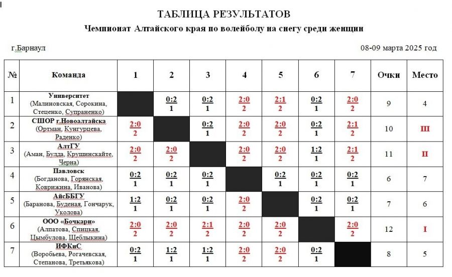 В составе команды-победительницы играют волейболистки, которые будут представлять Алтайский край на этапе Кубка России по волейболу на снегу - Анжелика Алпатова, Александра Цымбулова, Эльвира Щеблыкина (Анну Спицкую на барнаульском этапе Кубка России заменит Виктория Аман). Коллектив выступит под названием «Алтай».