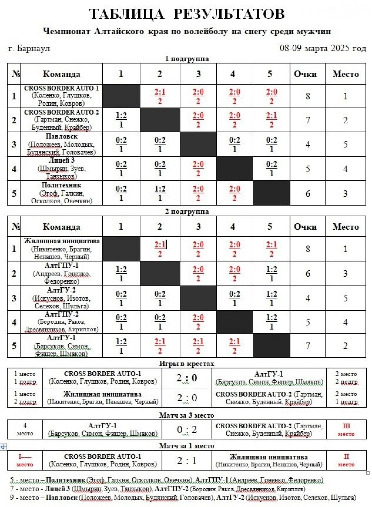 В финале квартет «Cross-Border Auto-1» выиграл у «Жилищной инициативы» - 2:1. За победителей выступали Роман Коленко, Михаил Глушков, Александр Родин и Илья Ковров. Именно эти игроки представят Алтайский край на домашнем этапе Кубка России (алтайский коллектив выступит под названием «Алтай-Снег»). Есть вероятность, что на этапе Кубка России в мужской сетке сыграет ещё одна команда из Барнаула - «Жилищная инициатива».