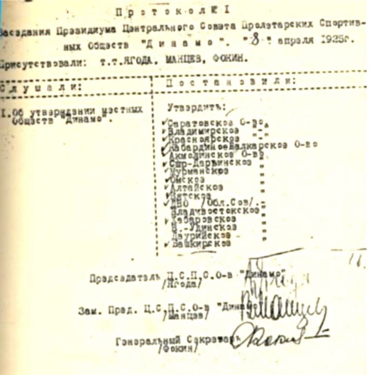 8 апреля 1925 года на заседании Президиума Центрального Совета Пролетарских спортивных обществ «Динамо» был подписан протокол об утверждении очередных 16 местных обществ динамовцев, среди них было и наше алтайское «Динамо».