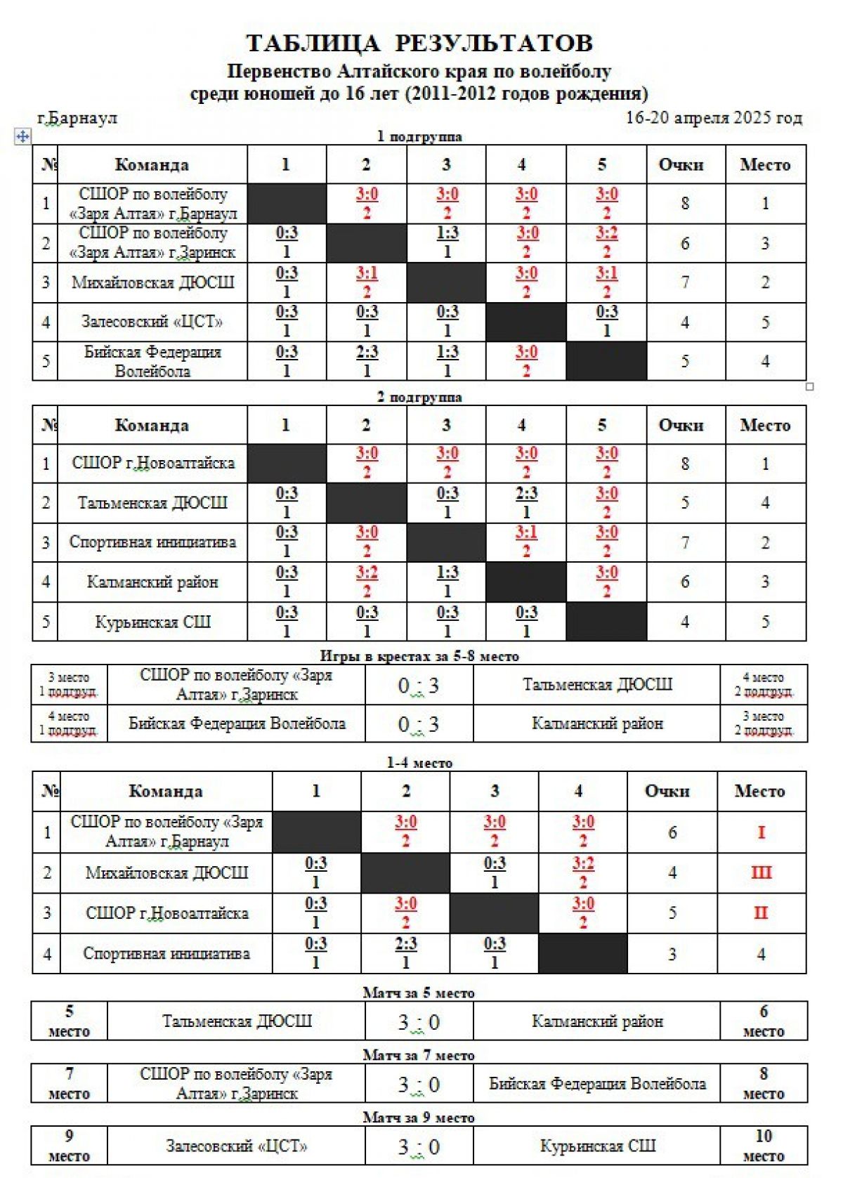 Победителями первенства Алтайского края стали воспитанники барнаульской «Зари Алтая». В финальном турнире за 1−4 места они всухую обыграли всех своих соперников с одинаковым счётом 3:0.