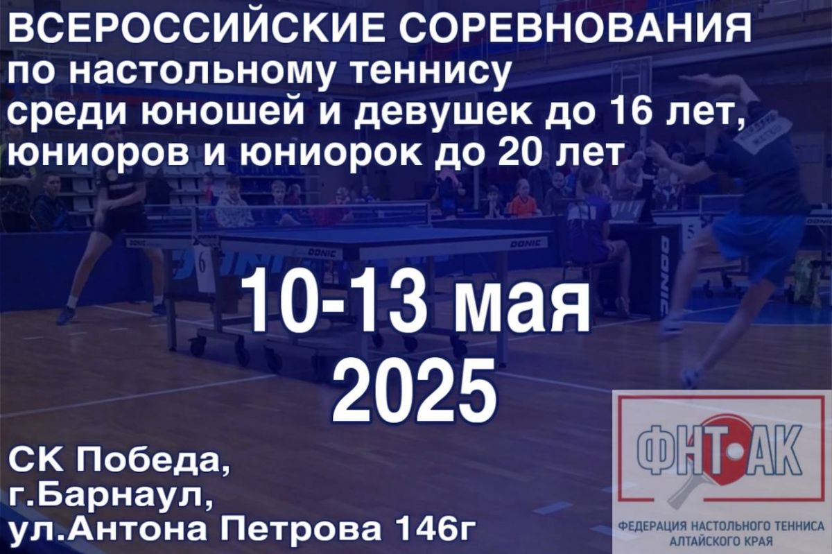 С 11 по 13 мая в Барнауле на базе СК «Победа» состоятся традиционные всероссийские соревнования по настольному теннису среди юношей и девушек до 16 лет, среди юниоров и юниорок до 20 лет. Турнир посвящён 80-летию Победы и Году Защитника Отечества.