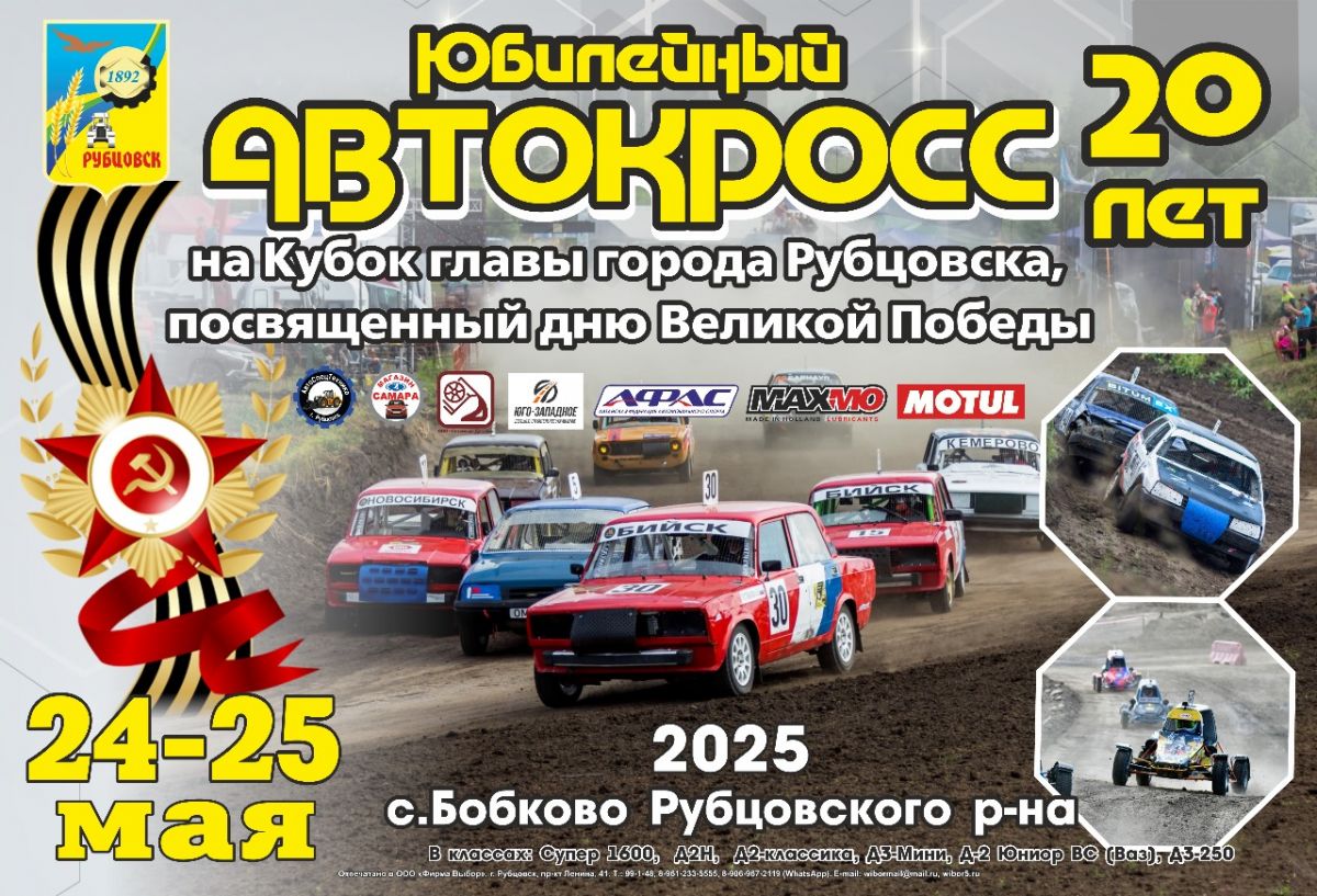 24 и 25 мая на трассе в районе села Бобково Рубцовского района пройдут соревнования по автокроссу на Кубок главы Рубцовска. Старты посвящены Дню Великой Победы.