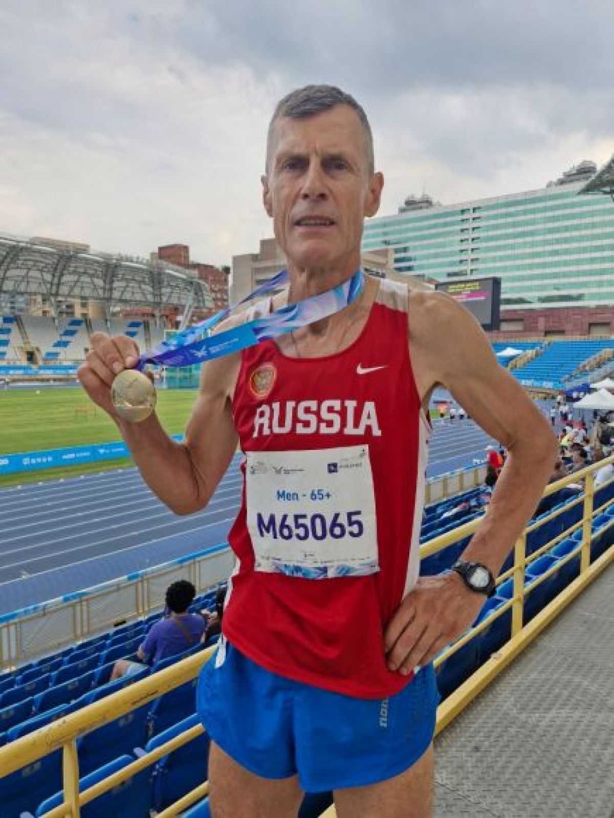 — Даже шиповки не стал надевать, вышел в кроссовках — думаю, без меня есть кому там побеждать. А тут ещё жара, влажность — когда двигаешься, на тебя будто в бане раскаленным веником машут. Финал состоял из двух забегов. Я с секундомером слежу за первым и понимаю, что ребята как-то не сильно торопятся. Потом стартовали мы. Европейцы отстали, впереди меня два азиата, один оторвался метров на 30. Понимаю, что бежим мы быстрее, чем участники первого старта. Думаю, можно и в призы попасть. И на последнем круге метров за 200 до финиша обогнал лидера — и в итоге победил. На следующий день было 800 метров, это моя основная дистанция. Смотрю, лица вокруг те же. Тут уж я сразу по своему графику стартанул, сразу вышел вперёд, — рассказывает бегун.