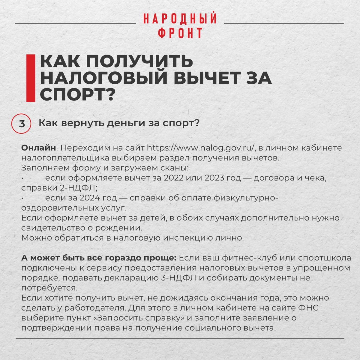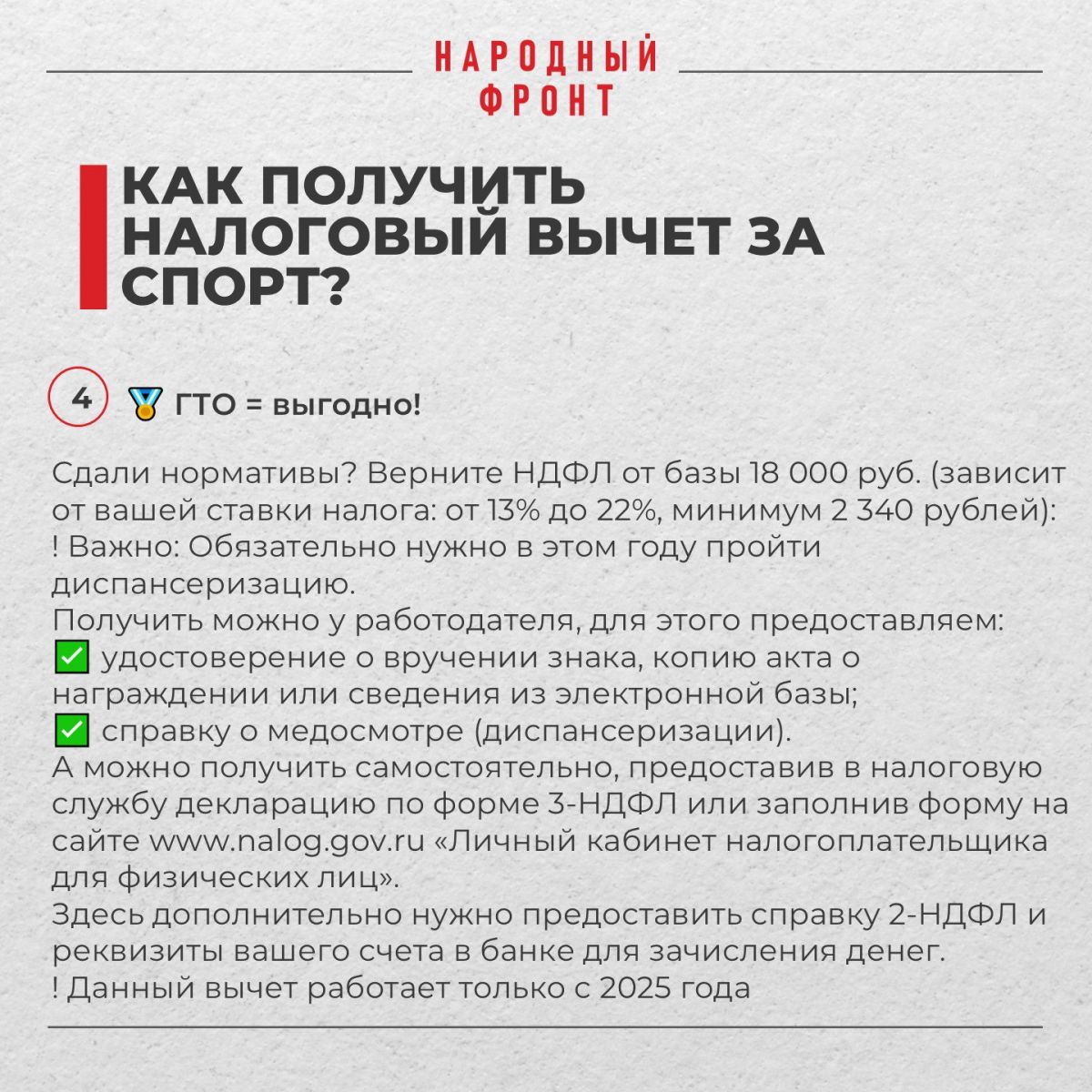 Но есть важное условие - кроме сдачи нормативов нужно в этом же году пройти диспансеризацию. Без неё на вычет претендовать нельзя! К примеру, если вы выполнили нормативы в 2025 году, то и диспансеризация должна быть датирована этим же годом.