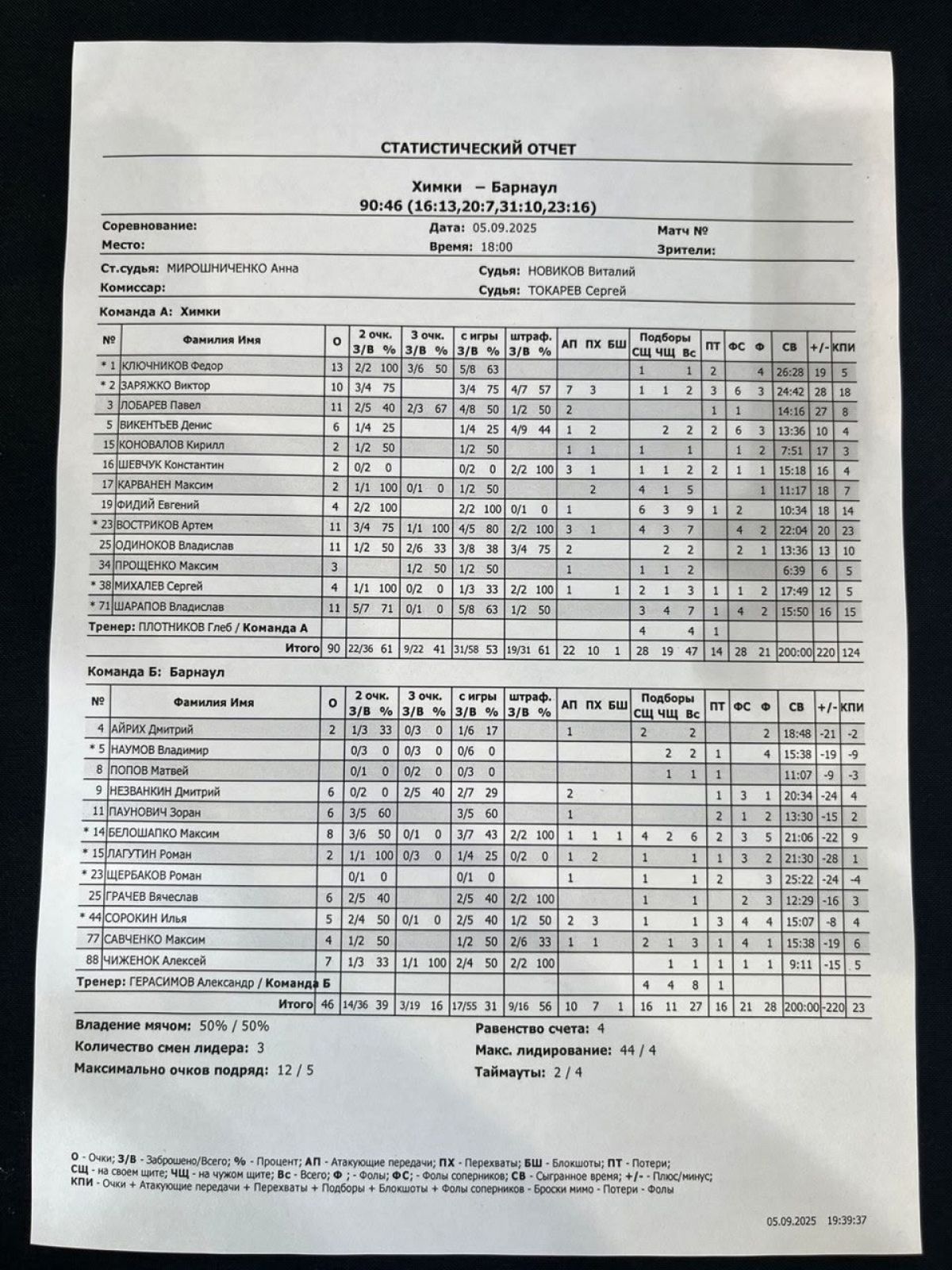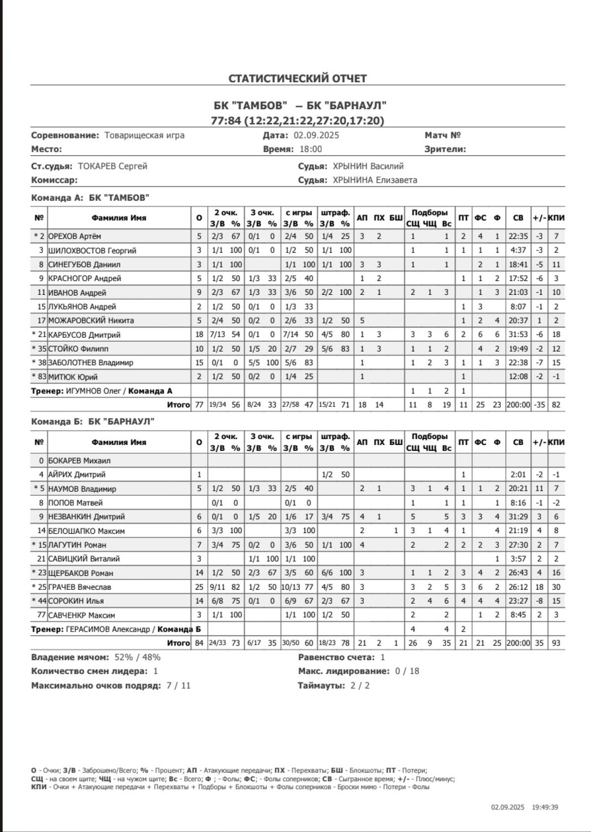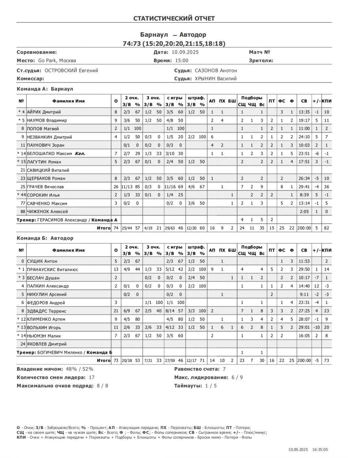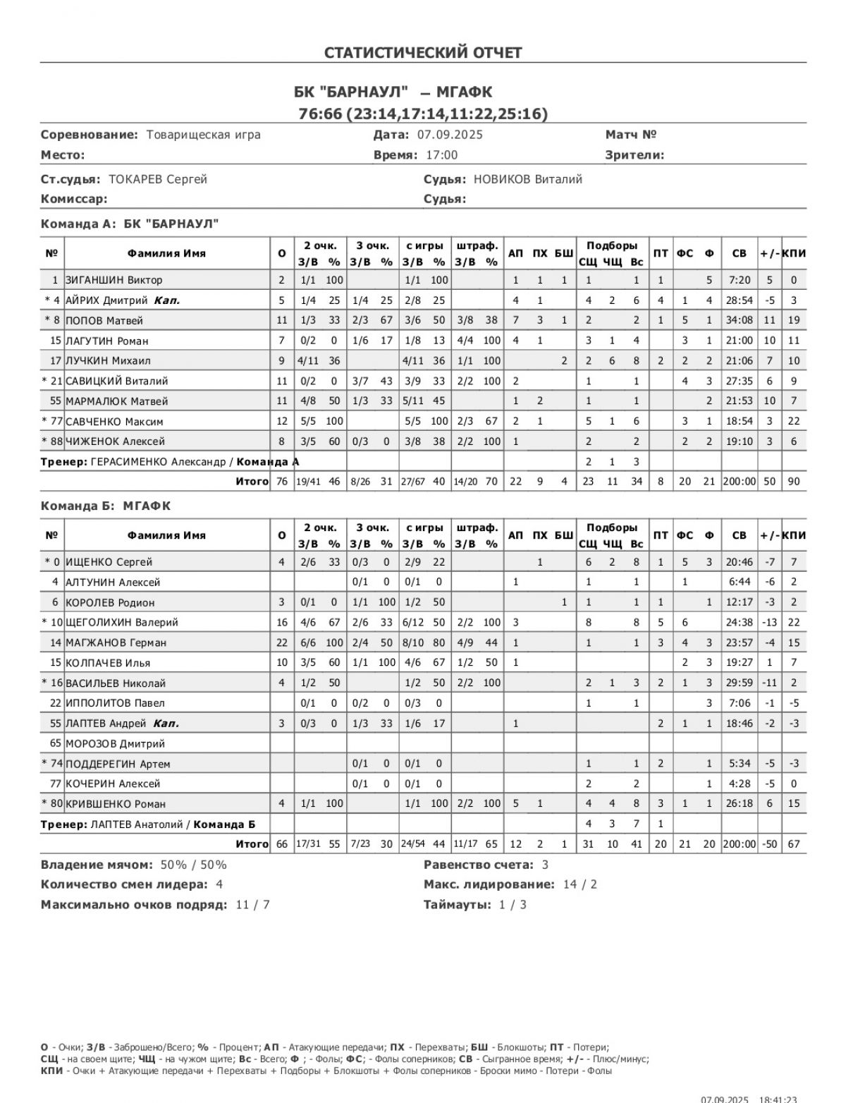 «Барнаул» - Савченко 12, Попов 11 + 7 передач, Савицкий, Мармалюк по 11.