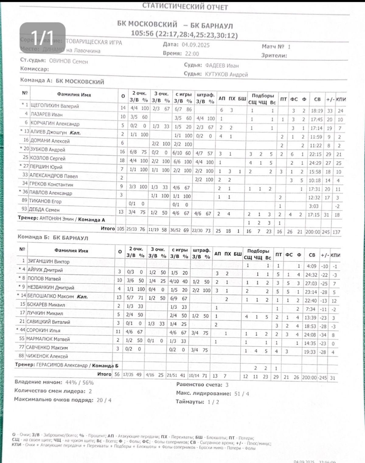 БК «Московский» (лига ЮБА) - БК «Барнаул» 105: 56.