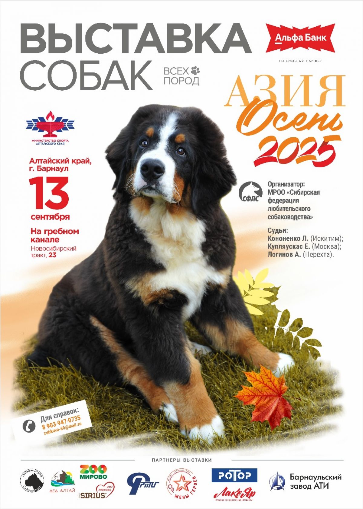 Выставка проводится Сибирской федерацией любительского собаководства (СФЛС) - старейшей кинологической организацией в Сибирском федеральном округе. «Азия Осень 2025» приурочена к 30-летнему юбилею организации, поэтому организаторы и партнеры сделали её не просто техническим мероприятием, а настоящим праздником. Собаководы выражают за это большую благодарность Правительству Алтайского края, Министерству спорта АК, Федерации гребли на байдарках и каноэ, сотрудникам и администрации Гребного канала и, конечно, спонсорам.