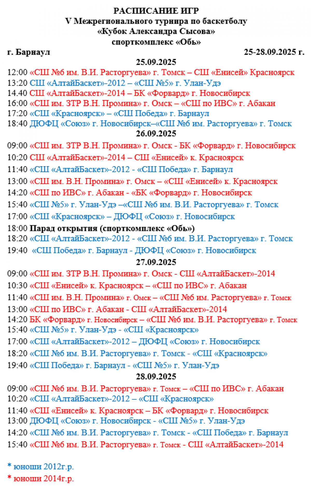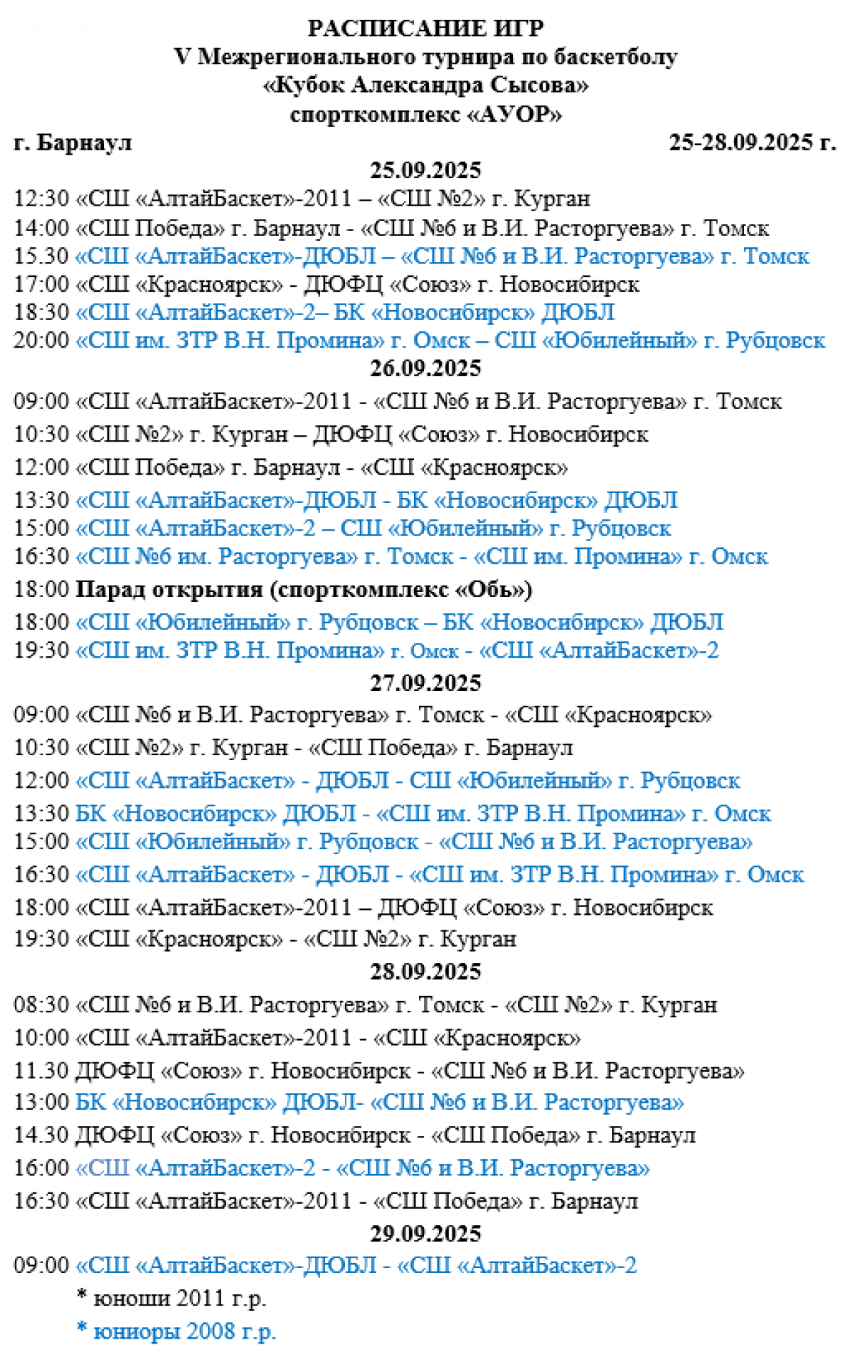 Традиционный турнир юных баскетболистов пройдёт с 25 по 28 сентября параллельно на двух площадках. Соревноваться будут спортсмены четырёх возрастных категорий:
