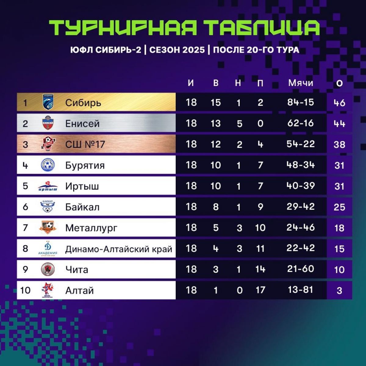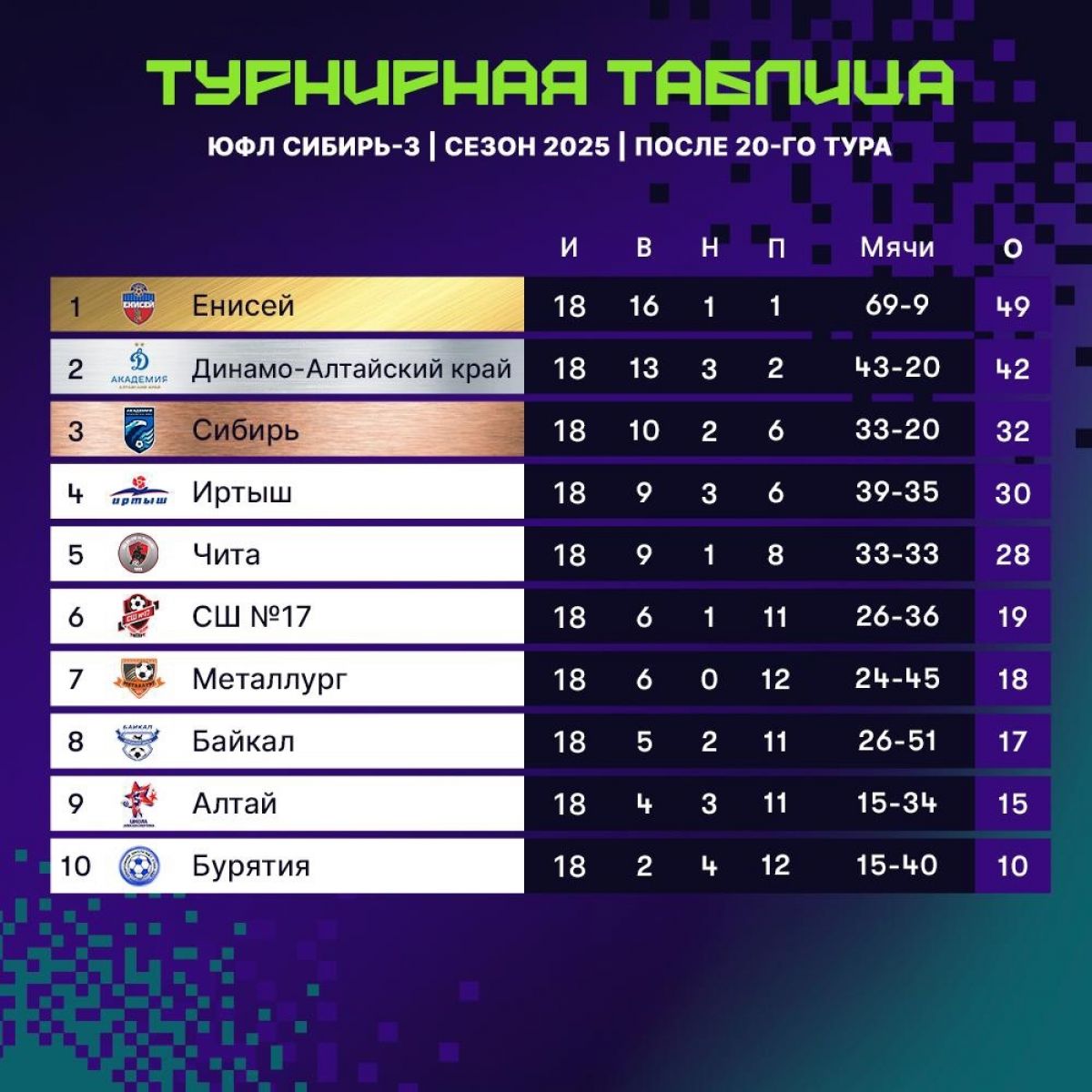 В субботу, 27 сентября, подошёл к концу сезон Юношеской футбольной лиги в Сибирском федеральном округе. Напомним, в 2025 году соревнования среди десяти сибирских команд проходили по двум возрастам - среди футболистов 2009 и 2010 годов рождения.