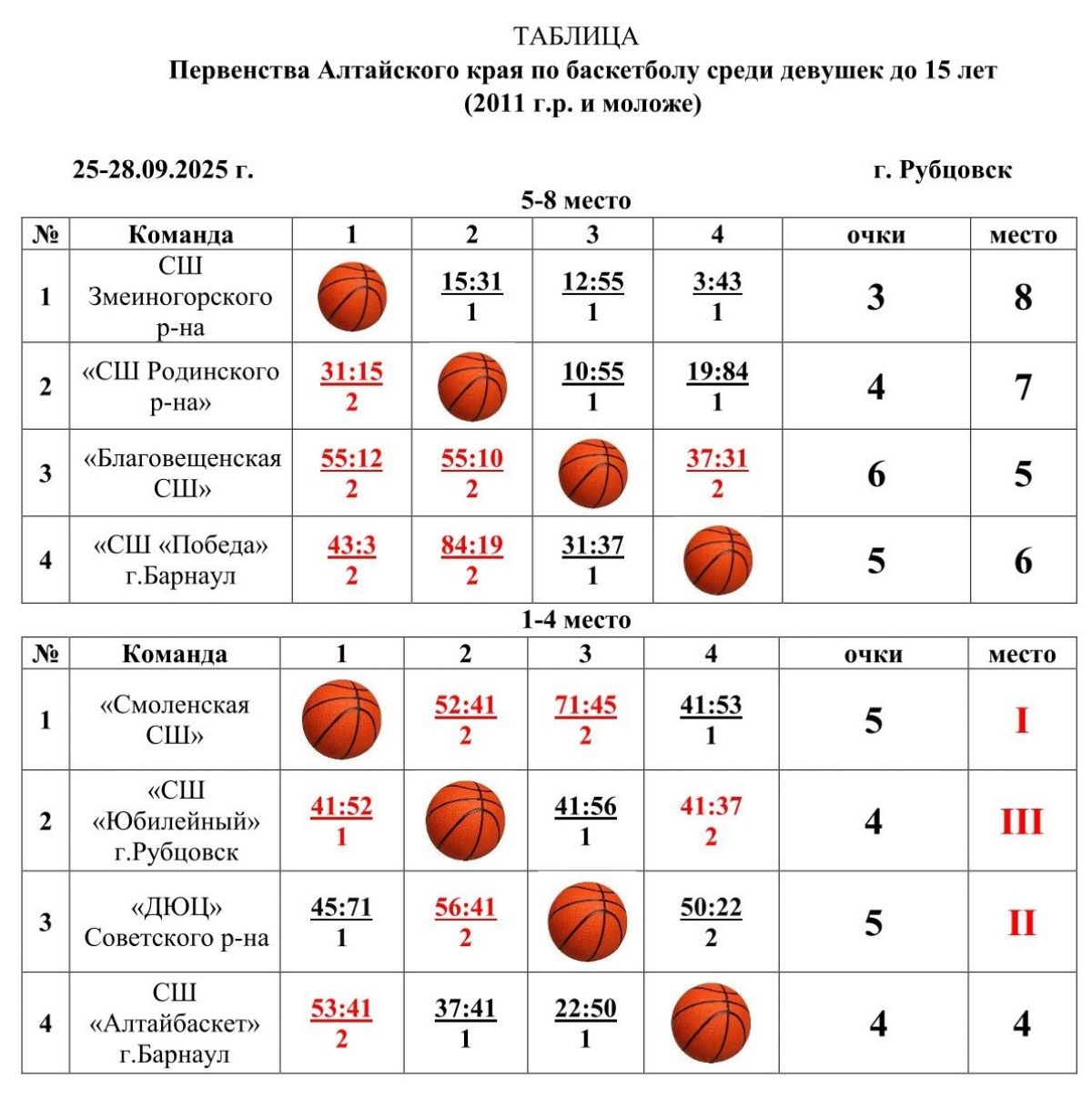 В Рубцовске с 25 по 28 сентября проходило первенство Алтайского края по баскетболу среди команд девушек до 15 лет. В турнире приняли участие восемь коллективов юных баскетболисток 2011 года рождения и моложе.