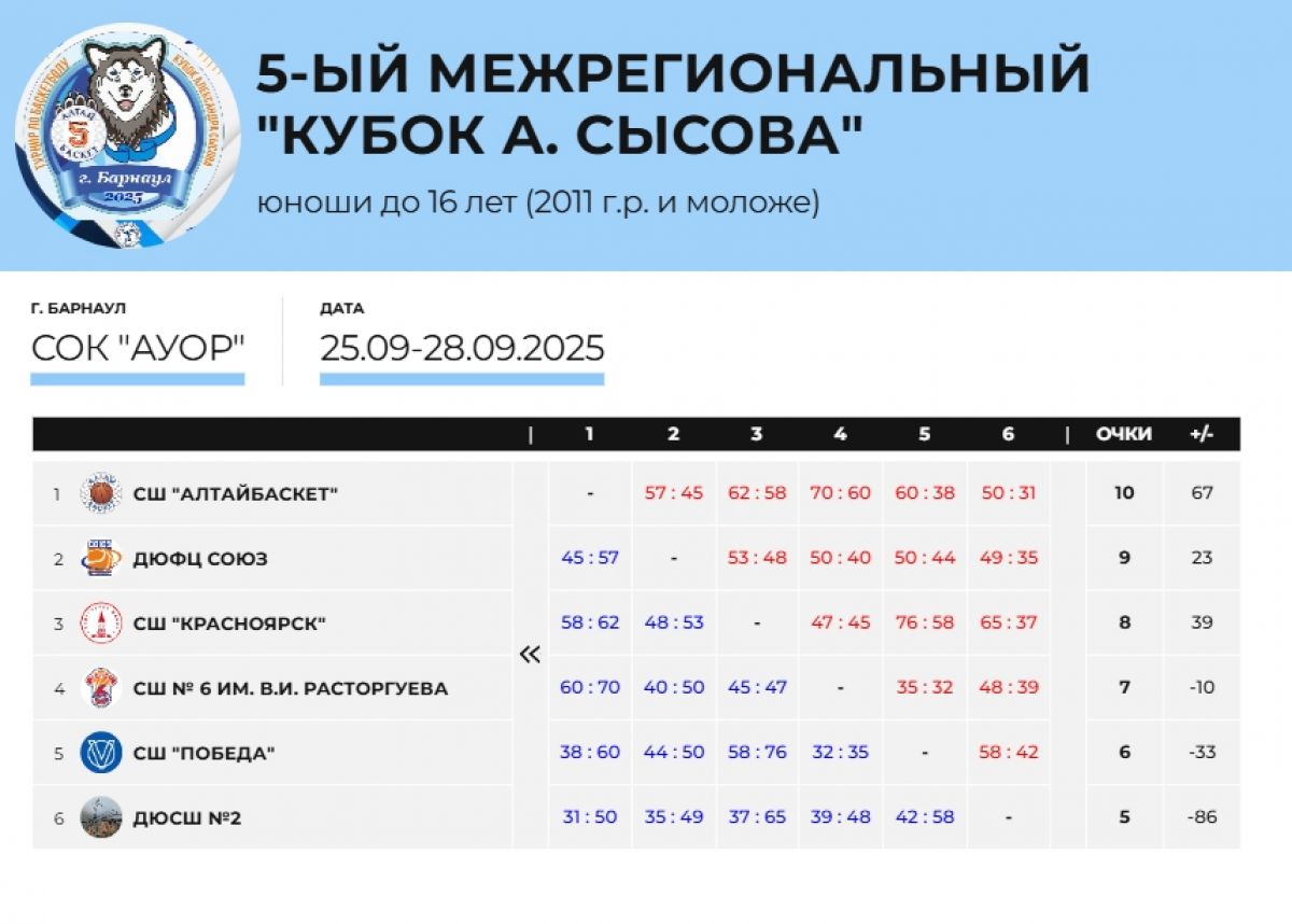 Хозяева площадки сумели выиграть турнир в одном возрасте - среди юношей 2011 года рождения первое место занял «АлтайБаскет» под руководством тренера Сергея Михайловича Штина. В трёх остальных возрастных группах спортсмены краевой школы «АлтайБаскет» стали вторыми.