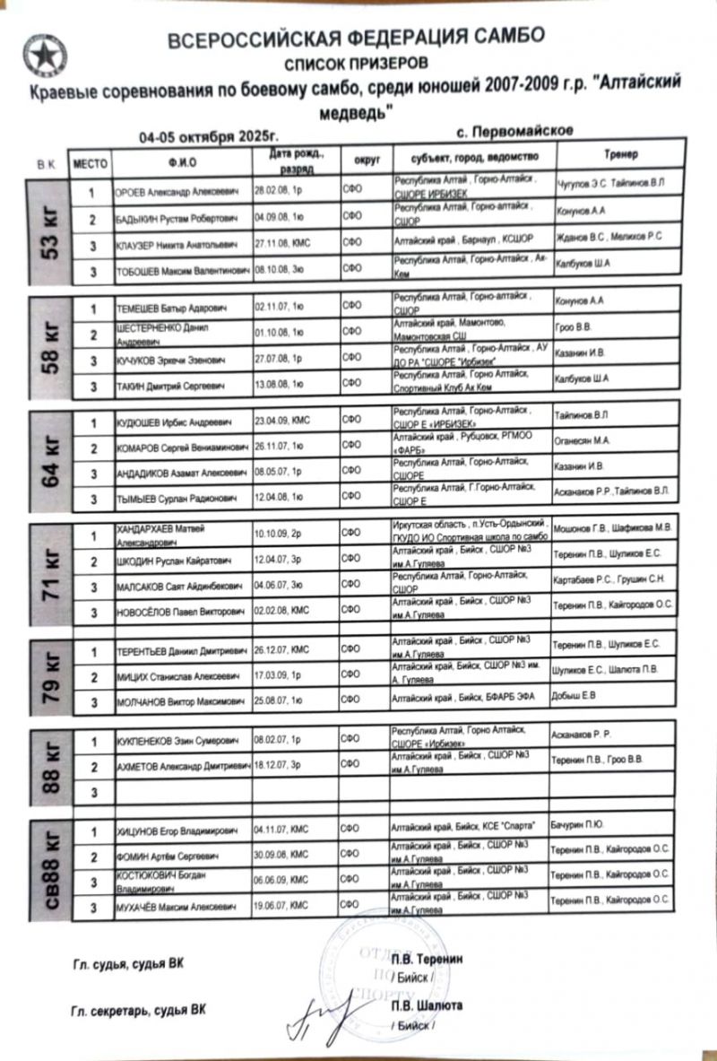 5 октября в селе Первомайское Бийского района впервые прошёл открытый краевой турнир по боевому самбо среди юношей 16−18 лет «Алтайский медведь».