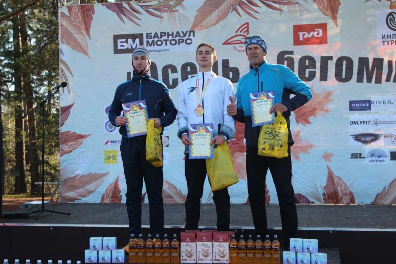 В мужских соревнованиях на дистанциях 5 и 10 км победили явные фавориты - Виктор Титов и Дмитрий Сморода. А вот в полумарафоне, закрывающим спортивную программу праздника, первенствовал мало известный в марафонской тусовке 32-летний работник Алтайской таможни Денис Попов. Это только второй его полумарафон. Первый он пробежал в мае на «Забеге.РФ» и с результатом 1:13:33 стал четвёртым. На «Осени с бегом» Денис выиграл дистанцию 21,1 км с результатом 01:12:49.