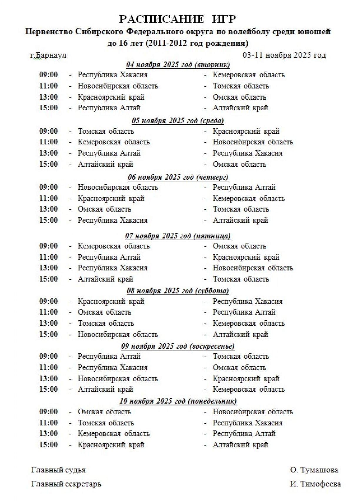 4−10 ноября. Барнаул. ФОК Краевой СШОР. Первенство Сибири. Юноши до 16 лет