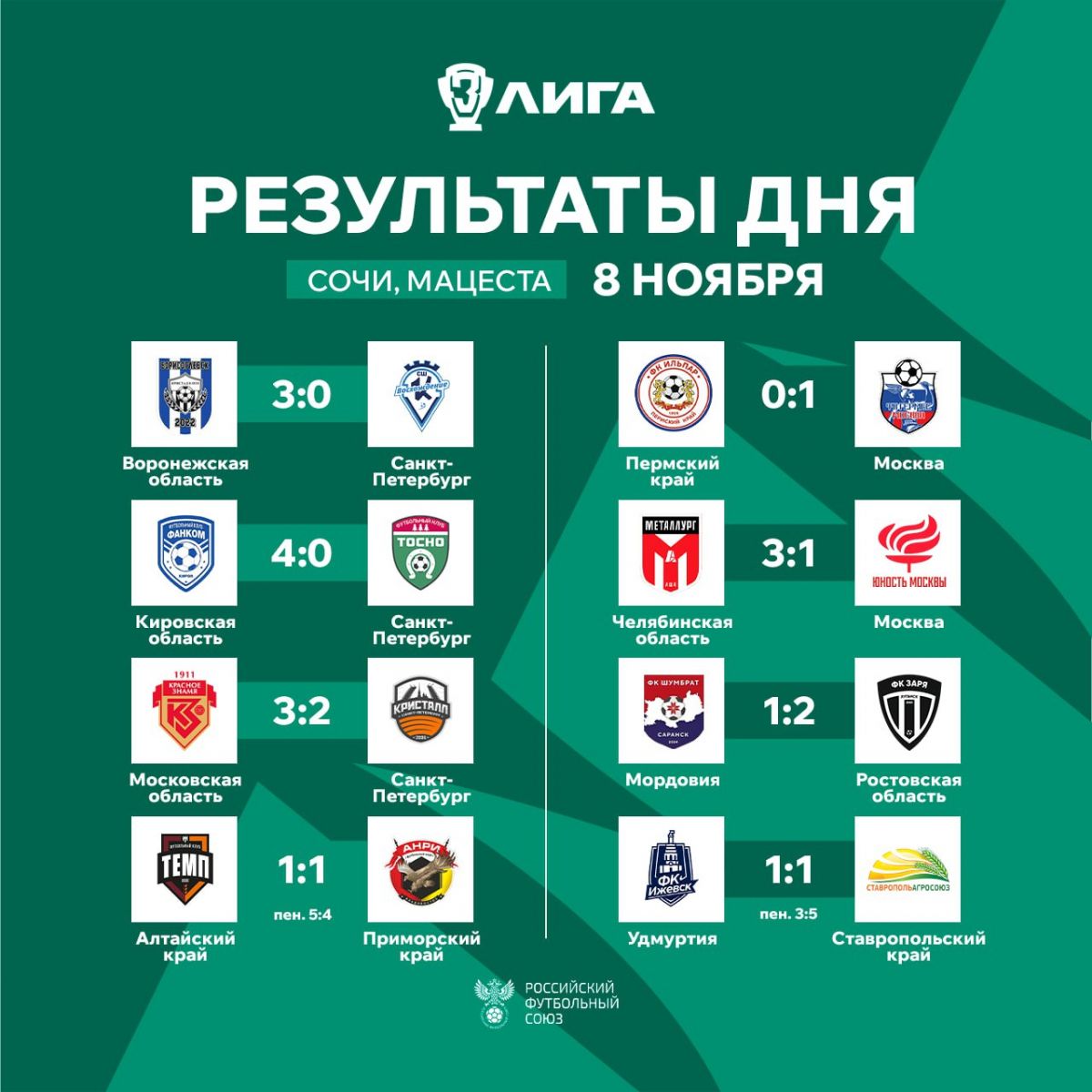 На полях футбольного центра «Мацеста» в Сочи продолжается розыгрыш финального турнира Третьей лиги. В рамках второго игрового дня 8 ноября состоялись восемь матчей второго тура группового этапа.