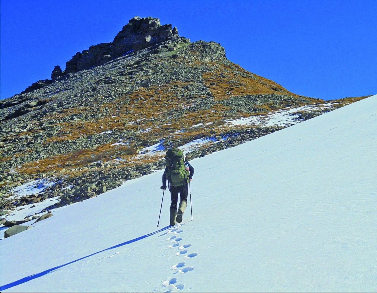 «Бескрайние плантации сухого, не упавшего под тяжестью снега, дягиля. Ветер в лицо. Вдруг на соседнем склоне увидели медведя. Появился внезапно, пасся на склоне соседней горы в двухстах-трёхстах метрах. Добывал и ел коренья. Издали показался мне чёрным. Нас не замечал. Сильный ветер уносил в сторону от него звуки наших разговоров и скрип шагов по снегу. Мы замерли и внимательно разглядывали его. Мне было не по себе. Так близко медведя видел только в зоопарке. Сейчас оградительной решётки не было. Сергей полез за файером. Видя, что медведь по-прежнему занят едой, осторожно двинулись дальше. Периодически оборачивались, разглядывая красавца. Скоро увидели волнами колышущуюся огромную, лоснящуюся от наеденного в зиму жира, задницу прыжками убегающего за скалы медведя. В этот раз шерсть выглядела бурой. Мне даже подумалось: «А не второй ли это медведь?»
