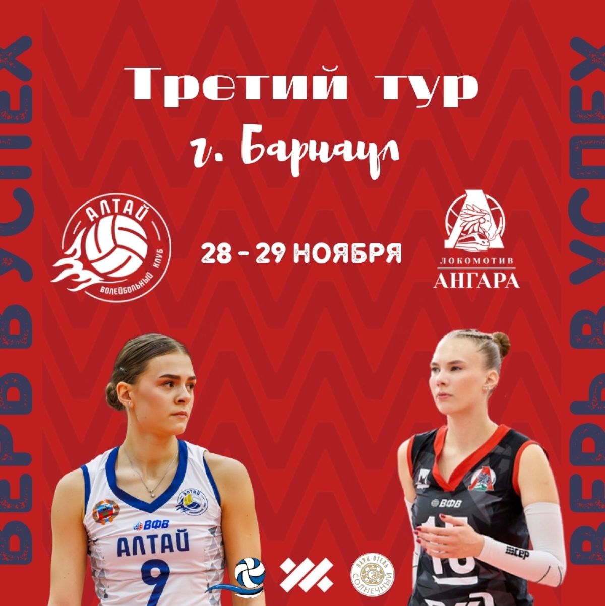 В пятницу и субботу, 28−29 ноября, в Барнауле на волейбольной площадке физкультурно-оздоровительного комплексе Краевой СШОР (ул. Юрина, 197 а) пройдут игры 3-го тура чемпионата России по волейболу среди женских команд Высшей лиги «Б» в группе «Сибирь» между местным «Алтаем» и «Локомотивом-Ангарой» из Иркутска.