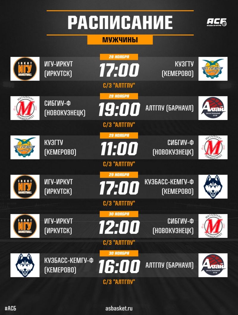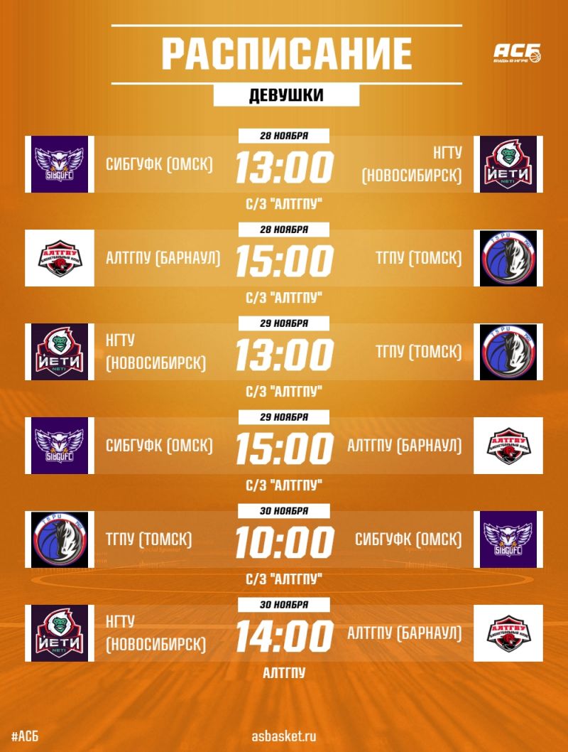 В спортивном зале главного корпуса Алтайского государственного педагогического университета 28−30 ноября пройдут игры чемпионата Ассоциации студенческого баскетбола (АСБ) в дивизионе «Сибирь» среди мужских и женских команд.