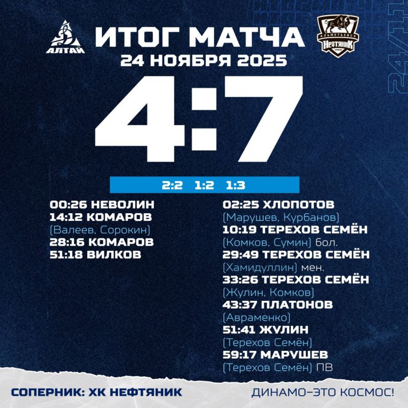 «Динамо-Алтай» (Барнаул) - «Нефтяник» (Альметьевск) - 4:7 (2:2; 1:2; 1:3).