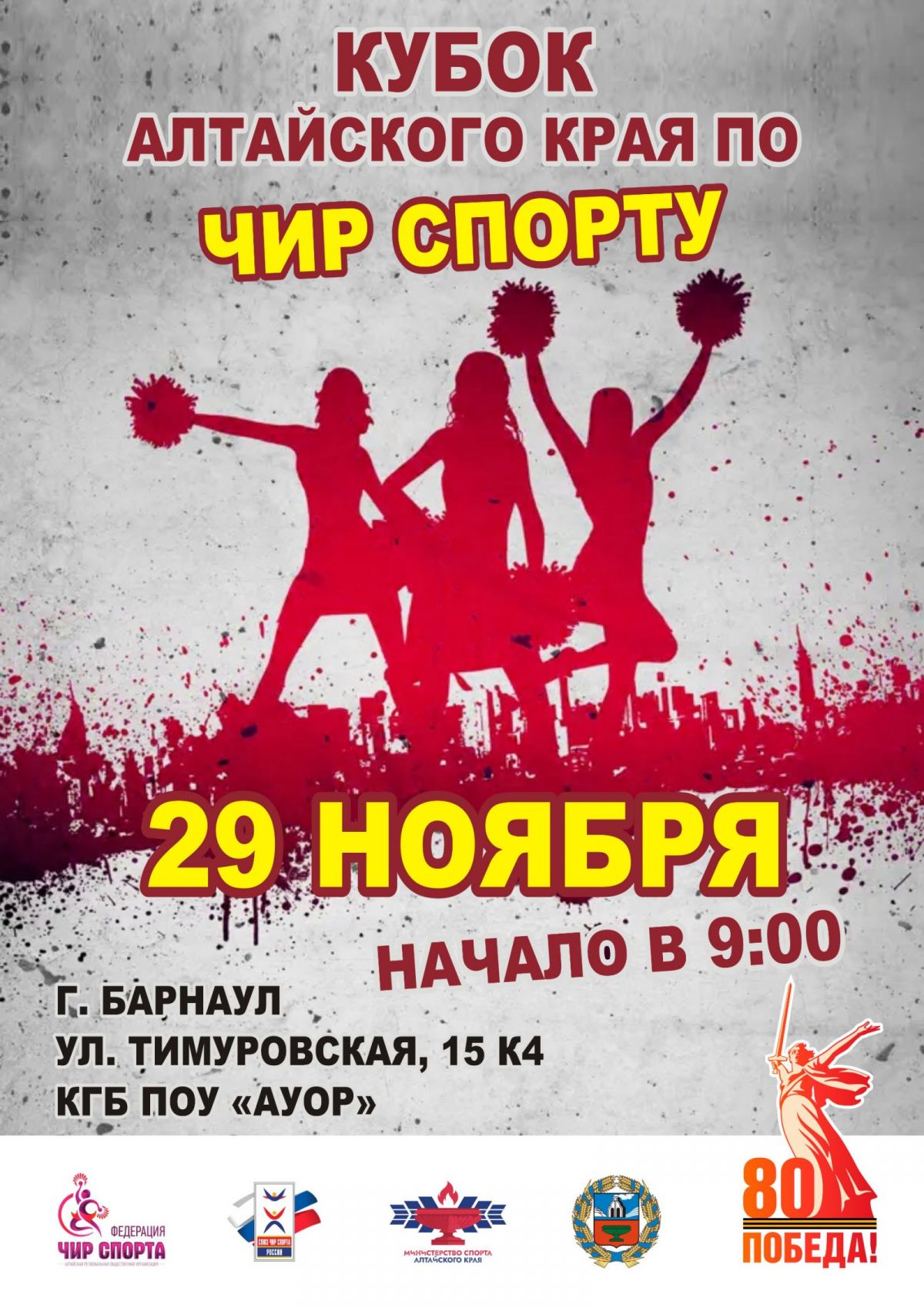 В субботу, 29 ноября в Барнауле в спортивном зале Алтайского училища олимпийского резерва пройдёт Кубок Алтайского края, а также краевые соревнования и фестиваль по чир спорту.