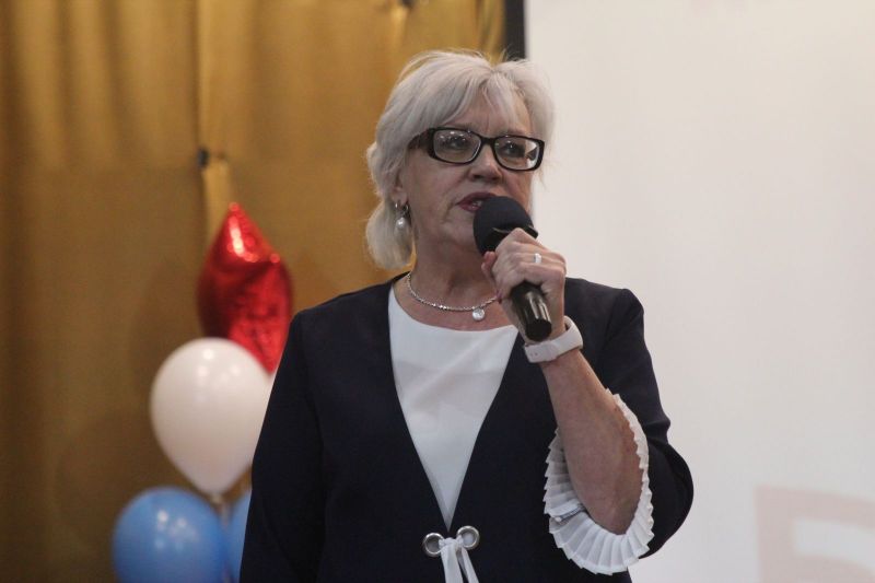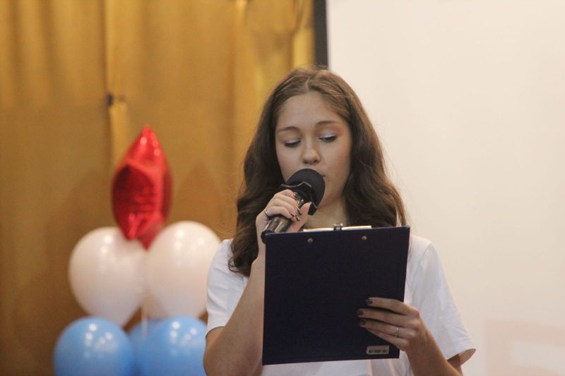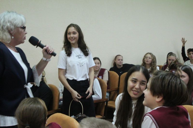 Светлана Викторовна Царёва, выступившая одной из соведущих праздничного мероприятия, подключила к игре и аудиторию актового зала. Она задавала вопросы на предмет знания своего училища.