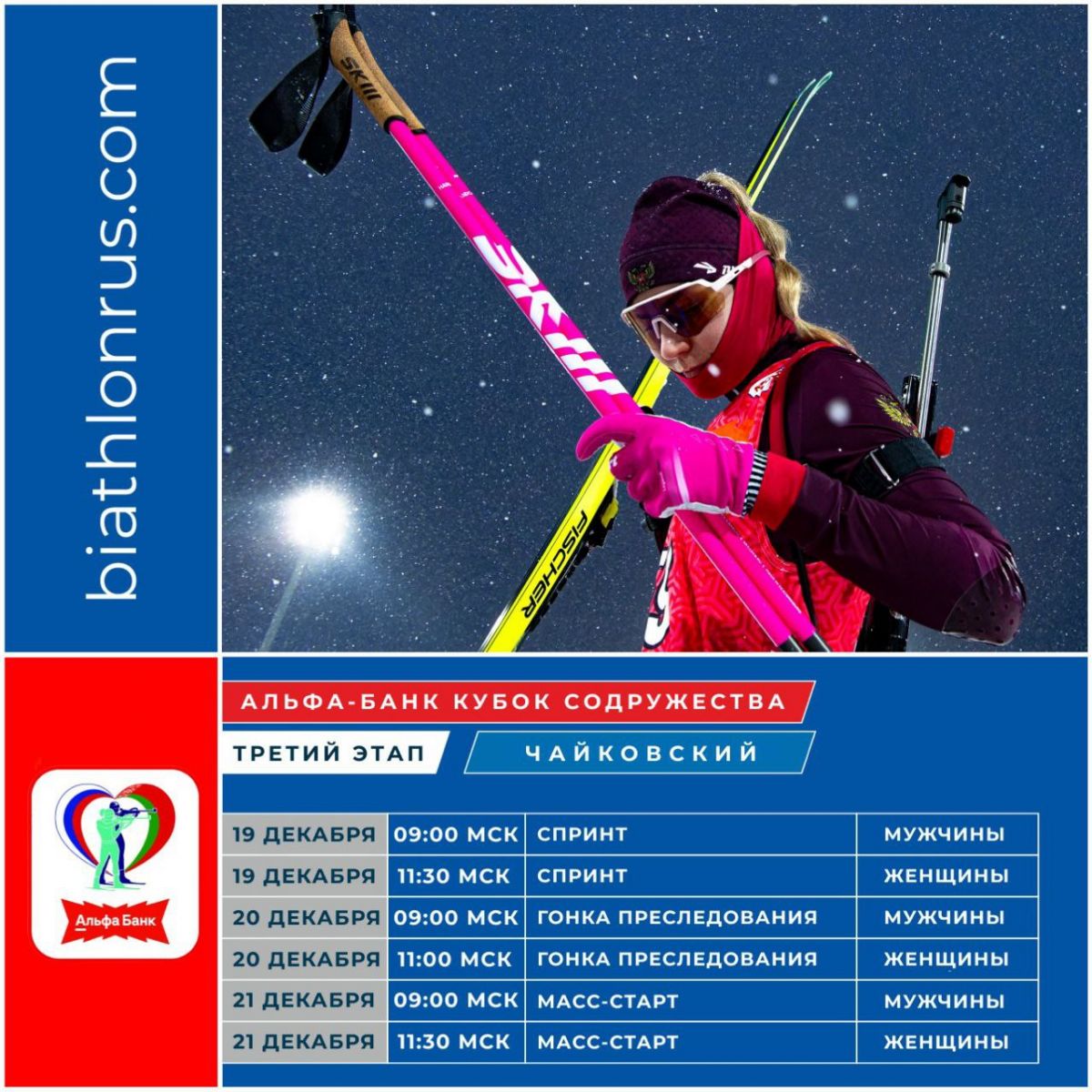 Третий этап соревнований с участием сильнейших биатлонистов России и Белоруссии будет включать в себя три дисциплины. В пятницу, 19 декабря, состоятся спринтерские гонки, на следующий день пройдут гонки преследования. В воскресенье, 21 декабря этап завершится двумя масс-стартами.