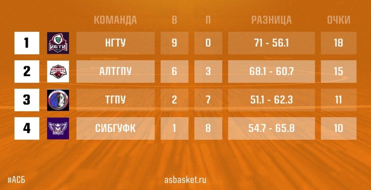 После кругового турнира баскетболисты АлтГПУ стали шестыми в турнирной таблице. На следующем этапе педагоги сыграют с командами, занявшими на первом этапе места с 5−8. Следом состоится «Финал восьми».