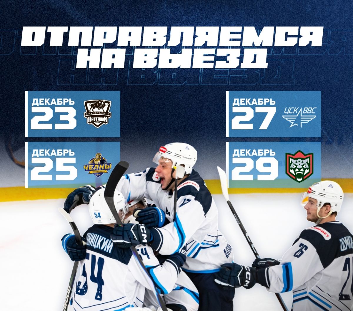 Динамовцы начинают серию 23 декабря матчем с «Нефтяником», 25 декабря команда сыграет с ХК «Челны», 27 декабря - с ЦСК ВВС. Завершит поездку встреча с «Барсом», которая пройдет 29 декабря.