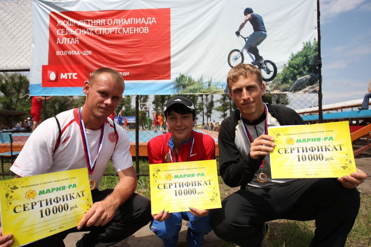Генеральный спонсор сельской олимпиады - компания «Мария-Ра» - отметила в этот раз лучших спортсменов крупными премиями: выделила сертификаты для приобретения спортивных товаров на общую сумму 150 тысяч рублей. Первые достались легкоатлетам. Сертификаты на 10 000 рублей получили победители в беге на 100 метров среди мужчин и женщин, а также в беге на 1500 метров среди мужчин.
