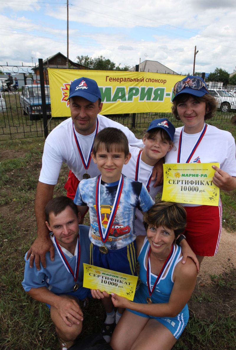 Беговая эстафета была последним видом в соревнованиях спортивных семей. Именно победа в этом виде обеспечила первое место семье Третьяковых (с мальчиком) из Немецкого национального района и семье Похоруковых (с девочкой) из Чарышского района. Обе они получили сертификаты от «Марии-Ра». И не только от неё. Спортивные семьи не оставила без внимания компания МТС - она вручила победителям сертификаты на услуги связи.