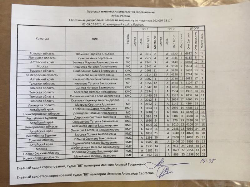 Первый тур Кубка России-2026 на озере Большом сложился для наших спортсменов крайне благоприятно. У женщин, которые соревновались исключительно в личке, на первом месте расположилась Валентина Кухленко, а на третьем - Марина Беляева. Перспективную девятую позицию занимала по итогам первого дня Татьяна Соломатова. Во втором туре Марина удержалась в тройке, а вот Валентина Кухленко, к сожалению, заняла только 16 место, став с самым большим уловом среди всех участниц - 6682 грамма, но с общей суммой мест «17» за два тура, лишь седьмой в общем зачёте. Дарья Гребёнкина заняла 14 место, Татьяна Соломатова - 17-е, Светлана Отмахова - 19-е, Аксана Буржинская - 22-е.