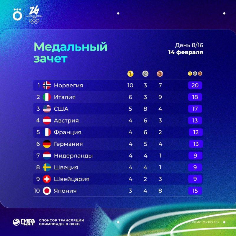 На Олимпийских играх в Италии 14 февраля было разыграно восемь комплектов наград.