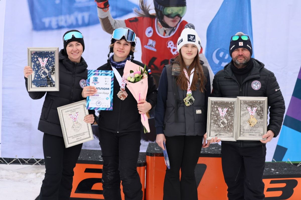В итоге на счету наших сноубордисток четыре награды первенства. Сначала Елизавета Ударцева завоевала золото в параллельном слаломе-гиганте среди девушек 13−14 лет, затем в этой же дисциплине Мария Травиничева стала второй среди юниорок. Ну, а в параллельном слаломе и Елизавета, и Мария с серебром (на фото девушки рядом со своими наставниками Сергеем и Александрой Макаренко).