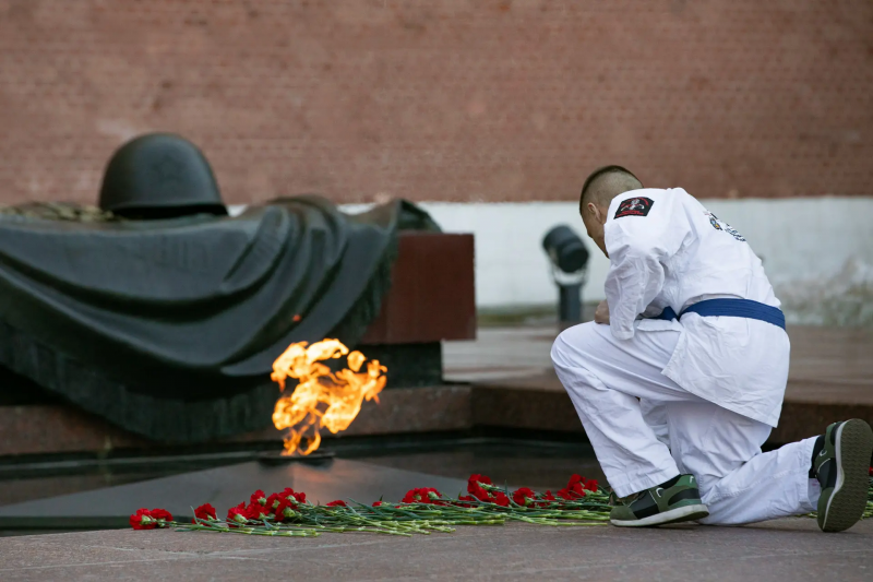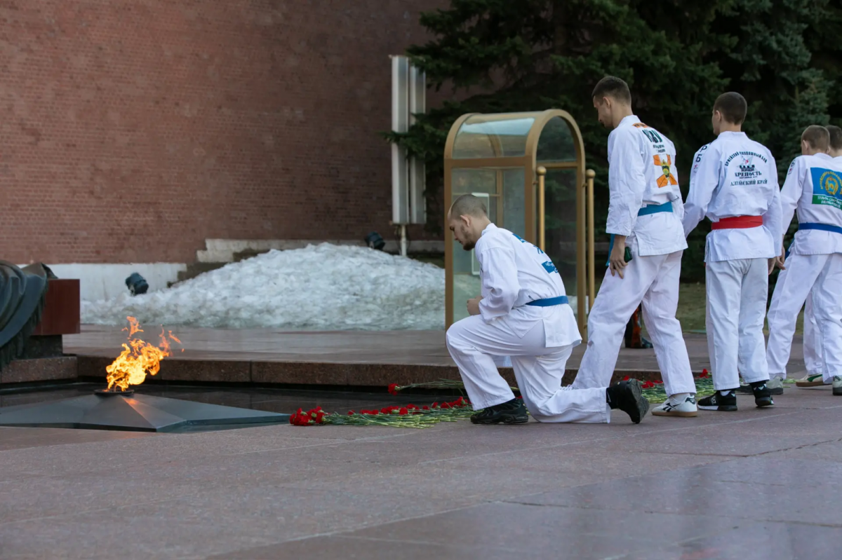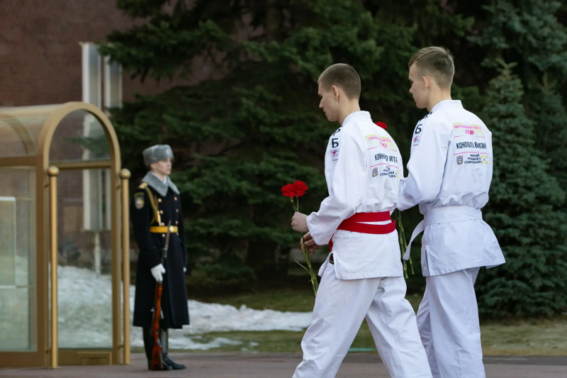 Участники первенства России по армейскому рукопашному бою-2026 провели митинг у Могилы Неизвестного Солдата близ Кремлевской стены и возложили цветы к Вечному огню.