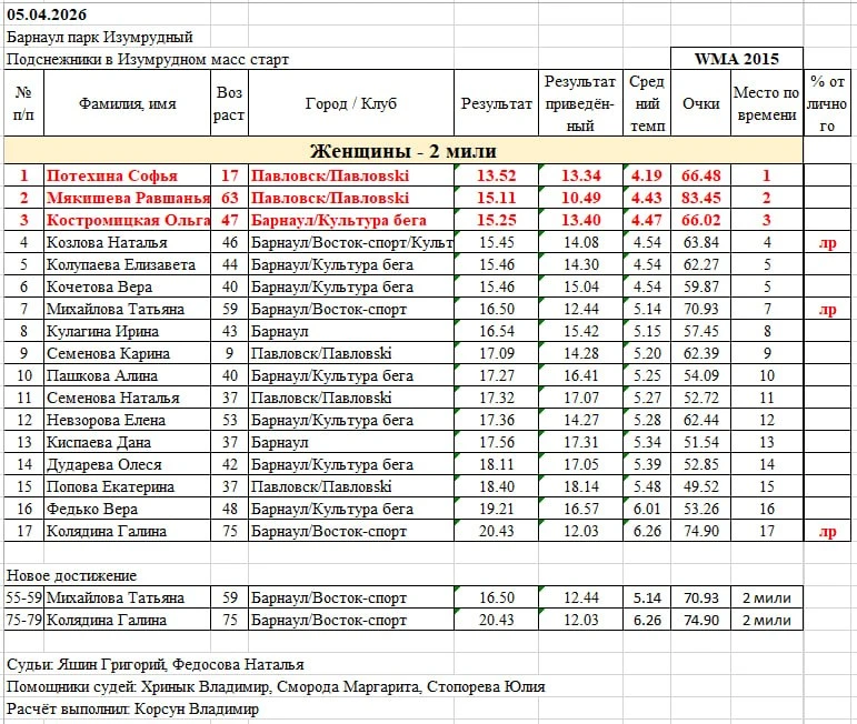 На дистанции 2 мили у мужчин первое место занял Иван Денисов из Павловска, вторым стал Алексей Семенов тоже из этого райцентра, третьим финишировал Алексей Хриник из Барнаула. У женщин лучшее время показала 17-летняя Софья Потехина из Павловского района, второй стала ее землячка Равшанья Мякишева, которая старше победительницы на 47 (!) лет. Бронза у Ольги Костромицкой из барнаульского клуба „Культура бега“.