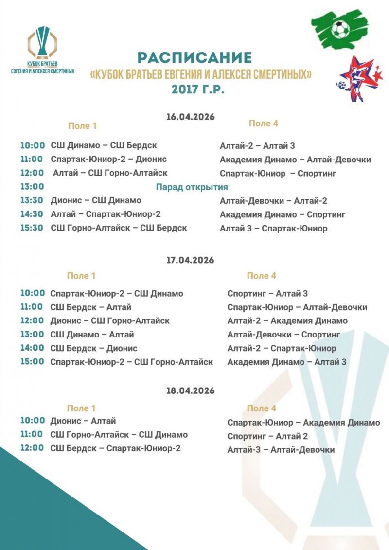 Соревнования пройдут с 16 по 19 апреля на полях стадиона СШОР Алексея Смертина.