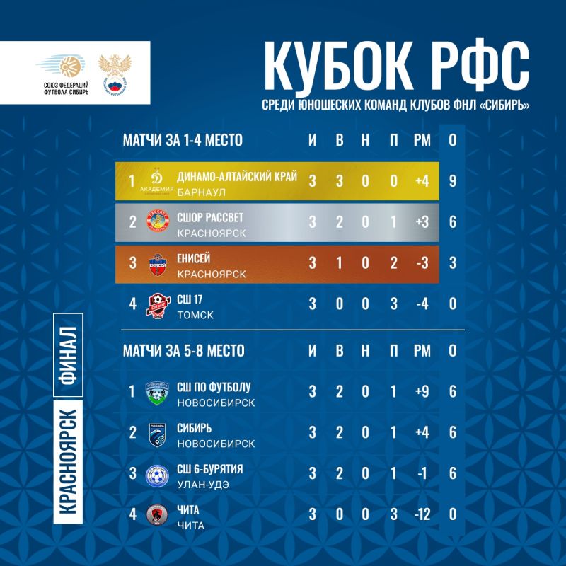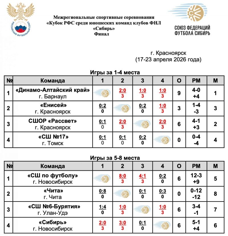 В Красноярске на стадионе «Футбол-арена «Енисей» с 18 по 23 апреля проходил финальный турнир межрегионального Кубка РФС среди юношеских команд клубов ФНЛ «Сибирь».