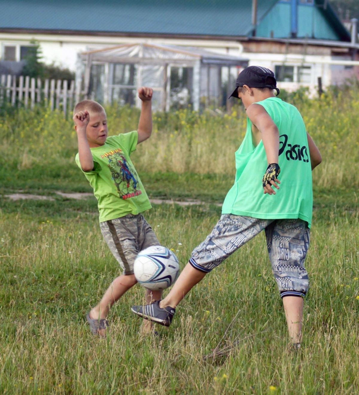 Кто-то уезжает на велике за Кирдяпкиным, остальные пока сетку на воротах расправляют. Минут через тридцать всё готово, можно и в футбол поиграть. Разбиваются на две команды, причём девчонок в составы тоже берут - сразу двух отправляют ворота защищать. Играют кто в чём: кто в кедах, а кто вообще в сланцах - но эмоции через край.