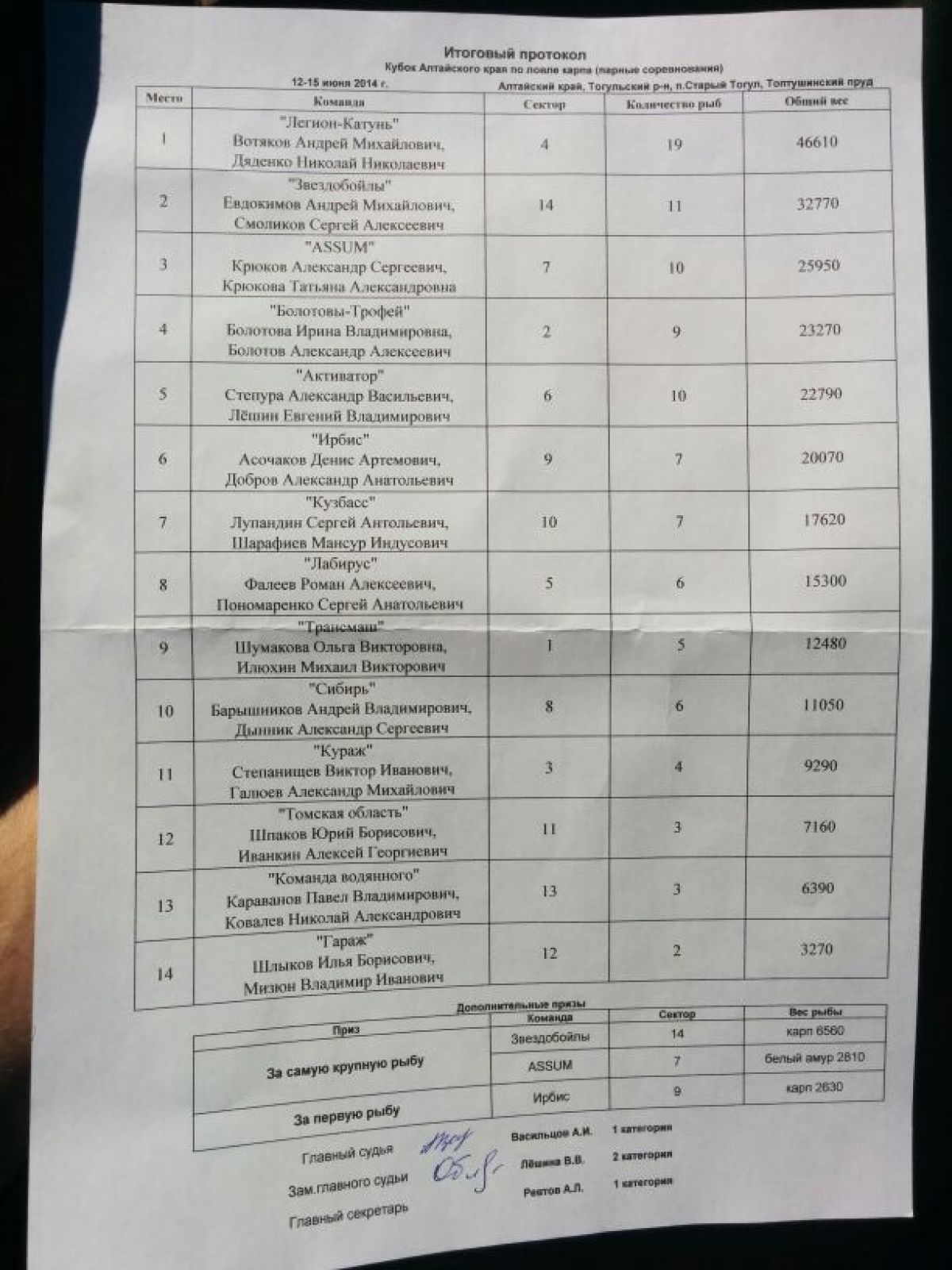 1 место - команда «Легион-Катунь» (Андрей Вотяков и Николай Дяденко). 19 рыб общим весом 46 610 грамм.